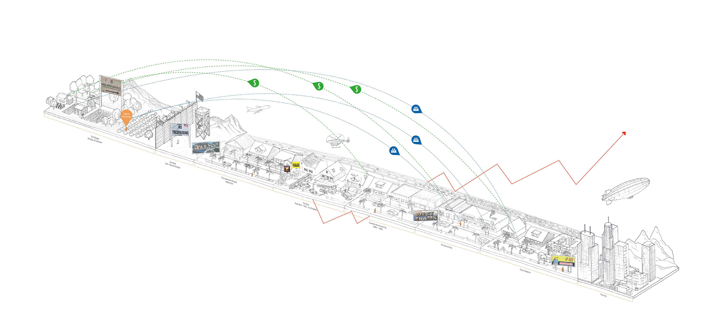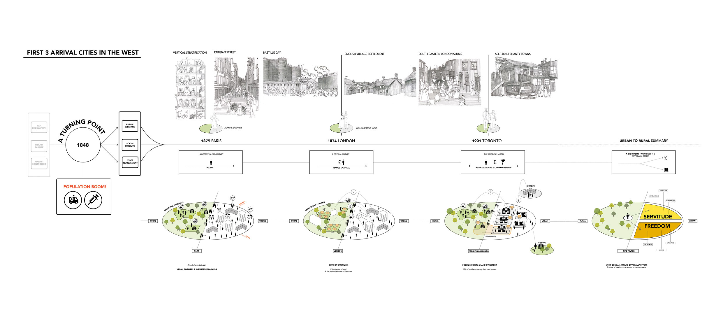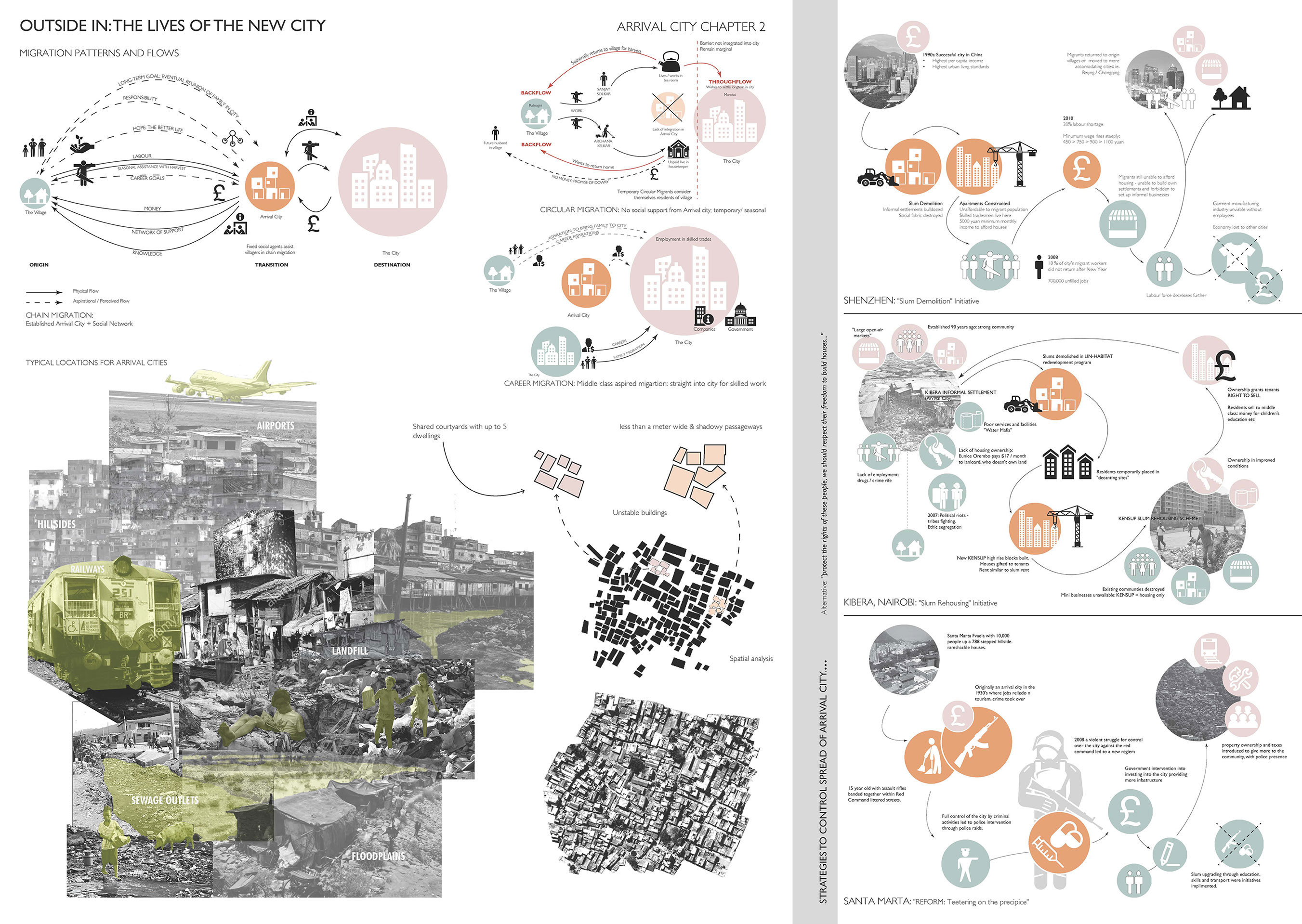 Studio Arrival City is underpinned by Doug Saunders book, Arrival City who describes them as operating as transitional spaces for those entering the city are the places where the next great economic and cultural boom will be born. The author Doug Saunders has explored the notion of mass rural to urban migration within his book Arrival City. The book takes a global look at the condition using precedents from across the globe to begin to set out the characteristics of what makes a successful Arrival City and the following drawings were created to represent the different chapters of the book.