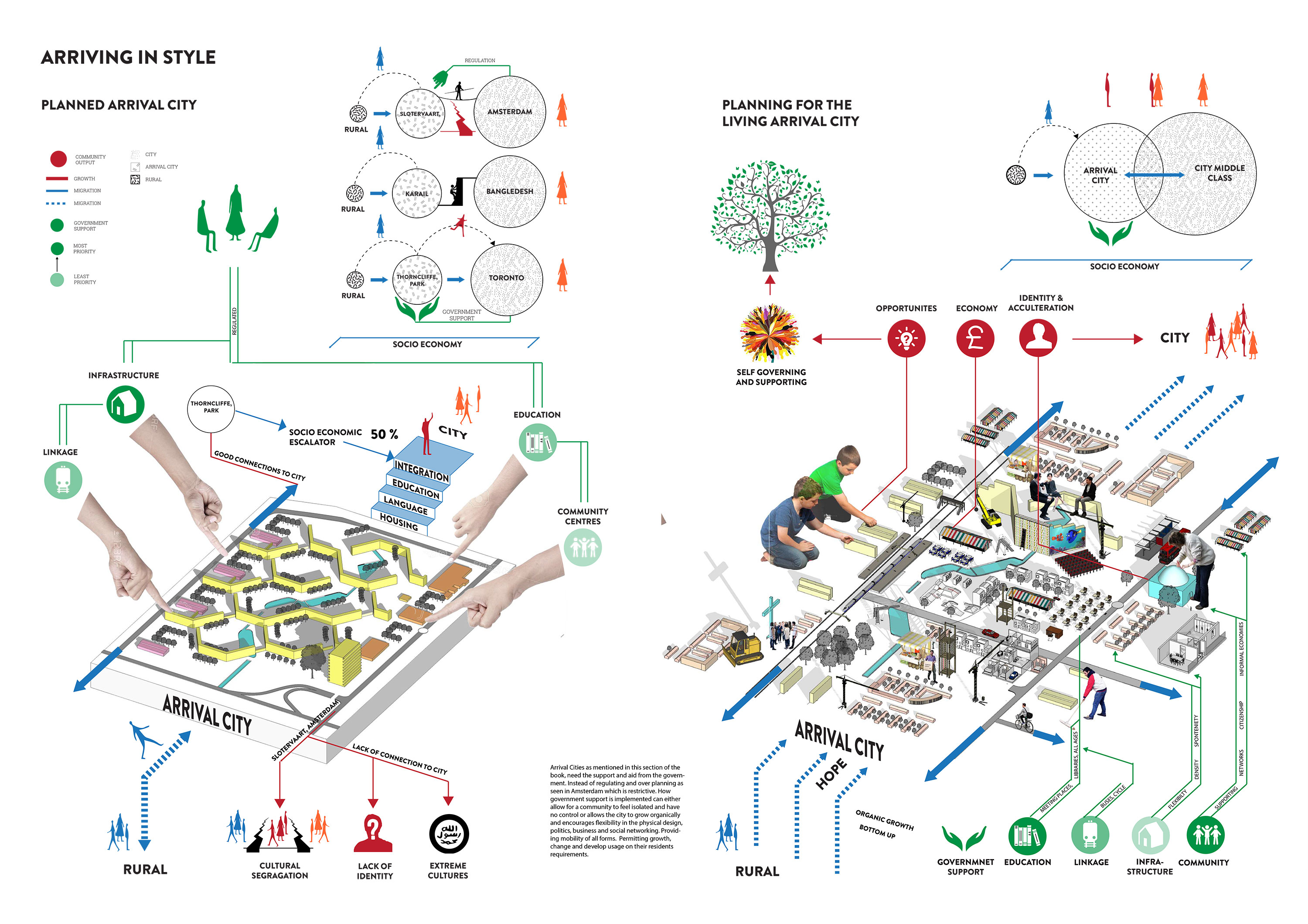 The chapter Arriving in Style in Doug Saunders book Arrival Cities (2016) portrays the necessity for governmental support in arrival cities. Saunders illustrates how government support can either allow arrival cities to grow organically as demonstrated in the example of Endcliffe Park, Toronto or become isolated and damage communities as experienced in Slotervaart, Amsterdam. The successful arrival city allows communities to grow, change and develop consistent with residents requirements. In doing so, it is encouraging the city to reflect on its own political, social and physical environment as demonstrated in the case studies represented in this chapter.