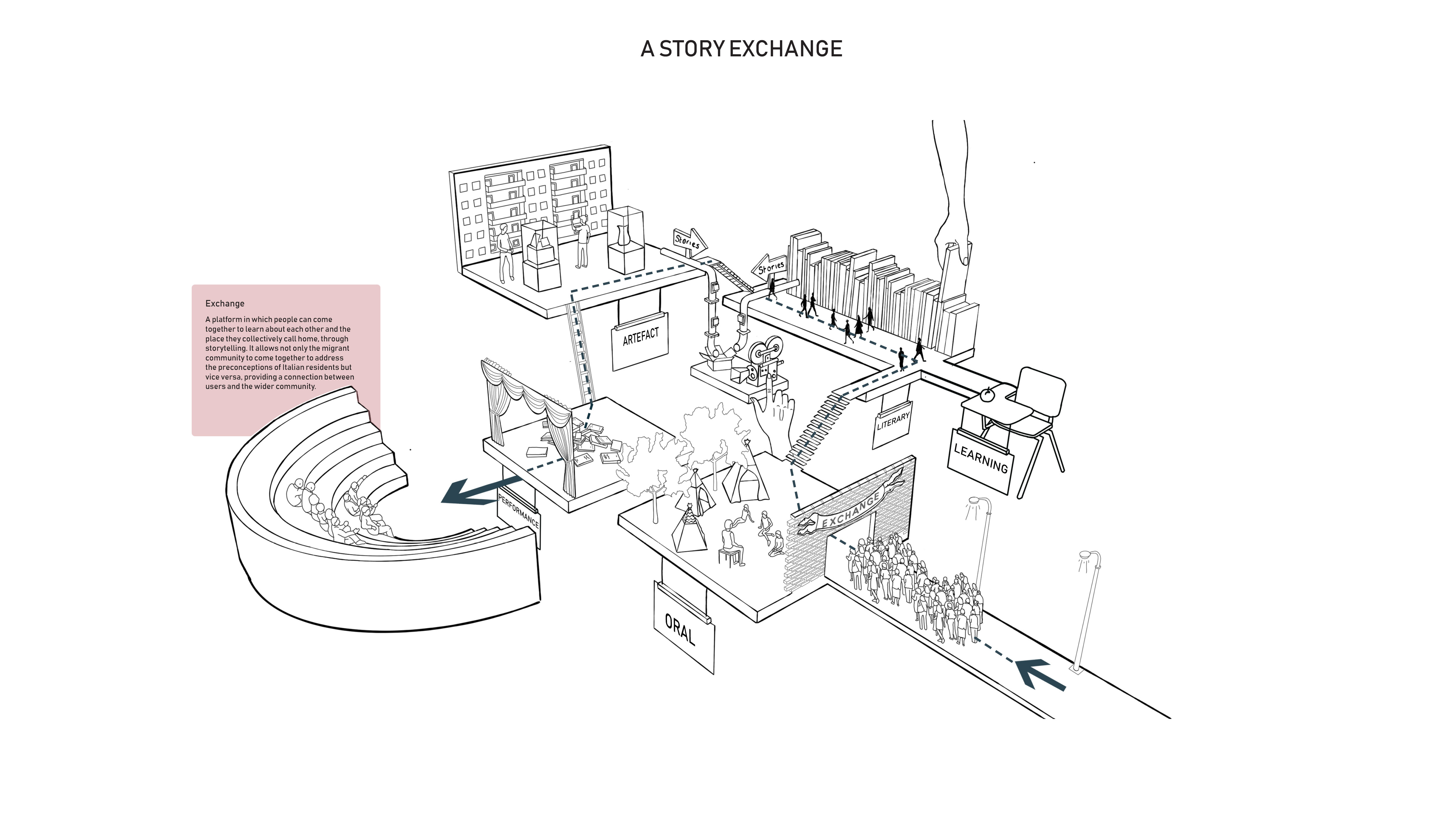 In certain contexts, the term ‘Migrant’ has become a catch all term. This socially constructed perception of a ‘migrant’ has become divisive in fulfilling political agenda and restricting the integration of the migrant population as their status becomes their identity. The Project is a platform in which people can gather and exchange their individual stories of self. The project facilitates storytelling on a variety of scales utilising architecture as an active storyteller rather than just a vessel for programmatic functions, dismantling preconceptions and educating a community to see each other as people rather than the ‘migrants’ or ‘Italians’ that they are reported as.