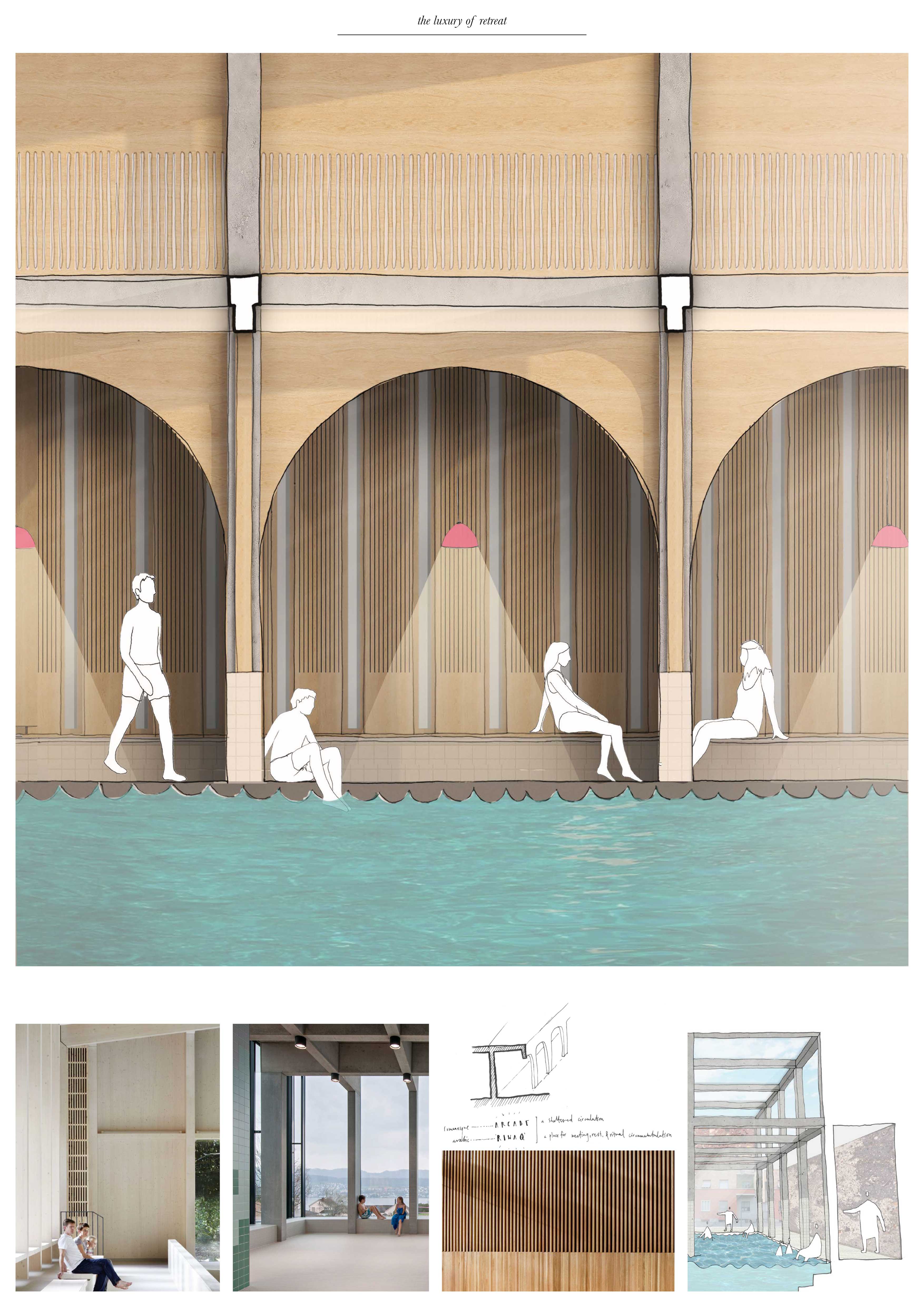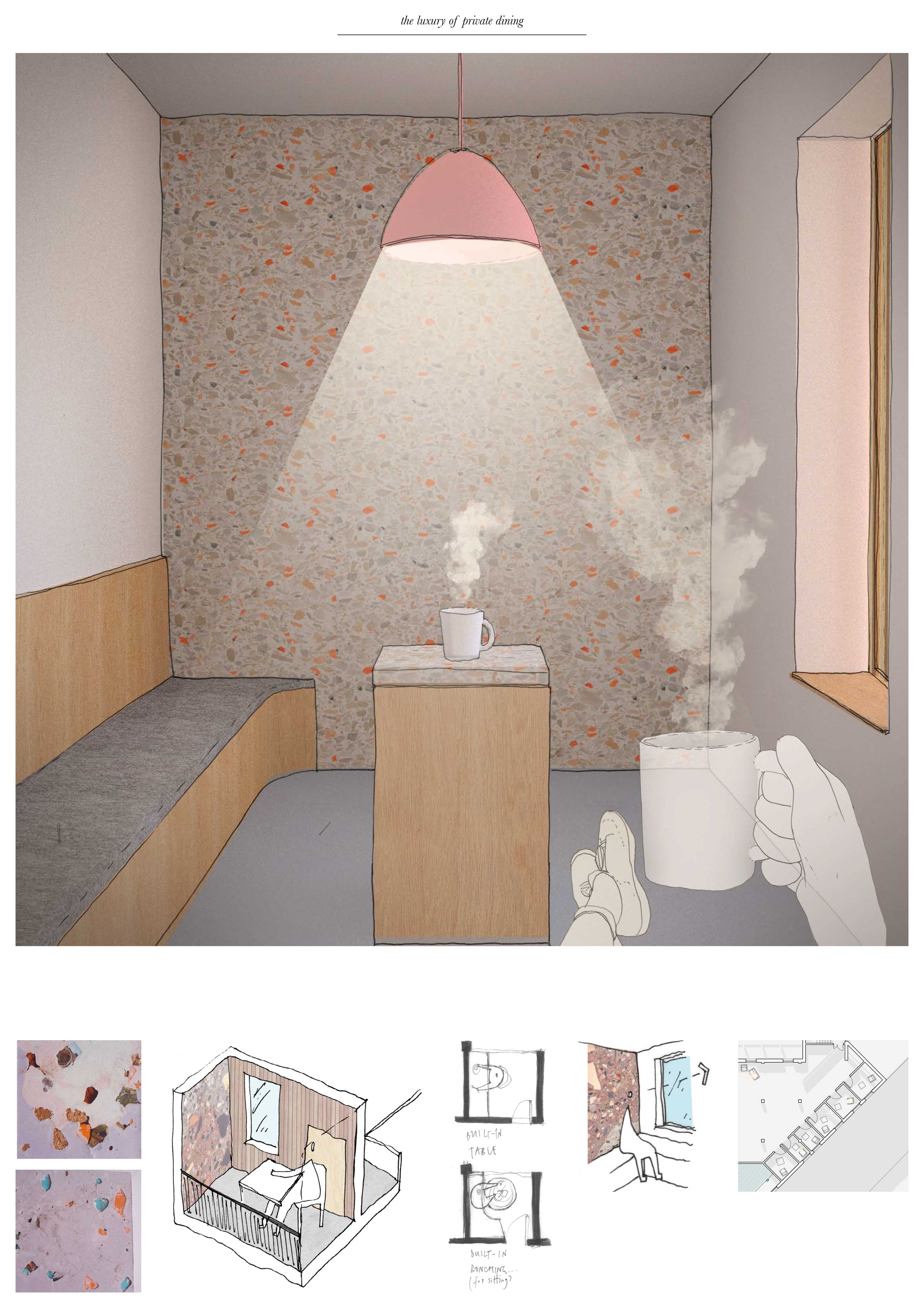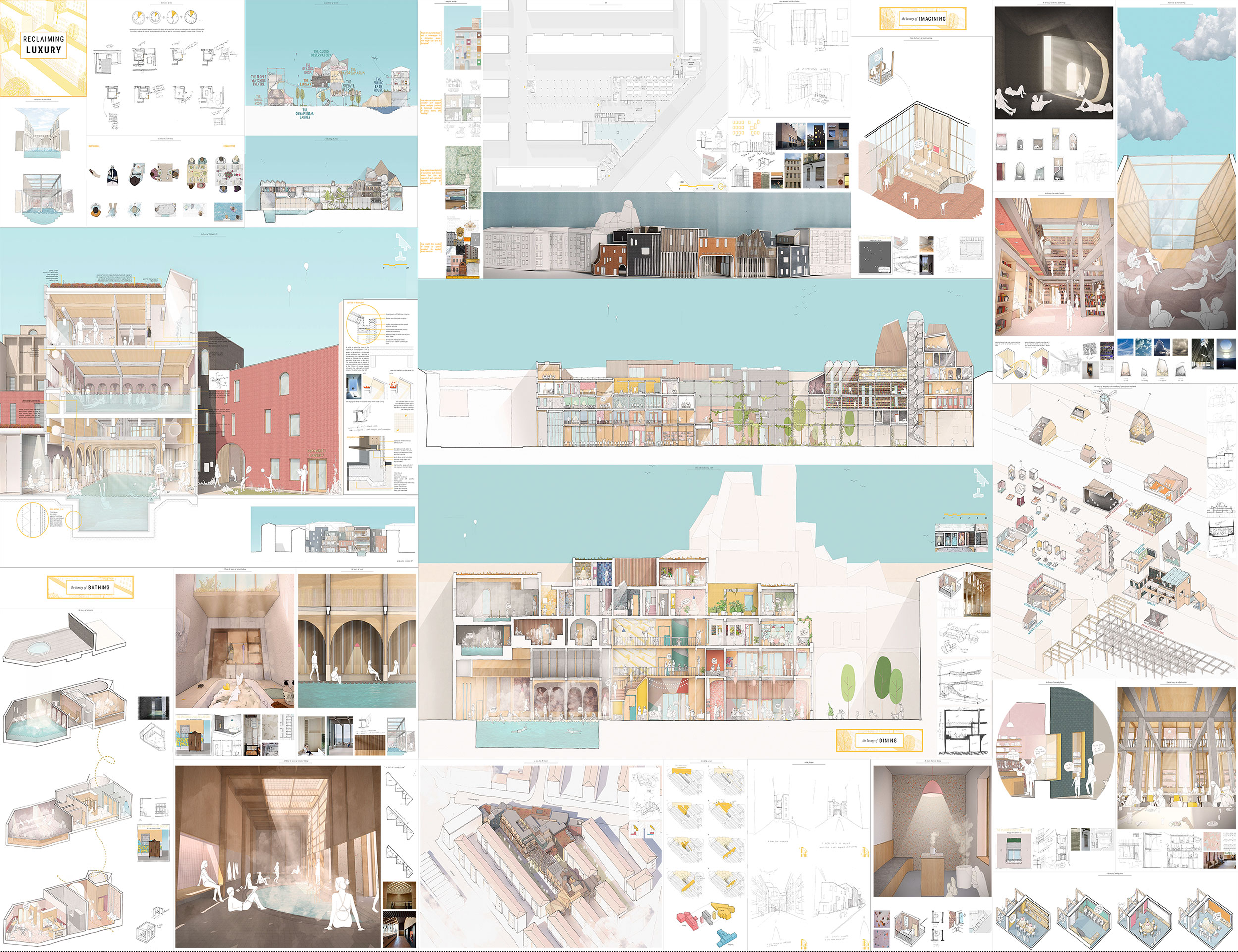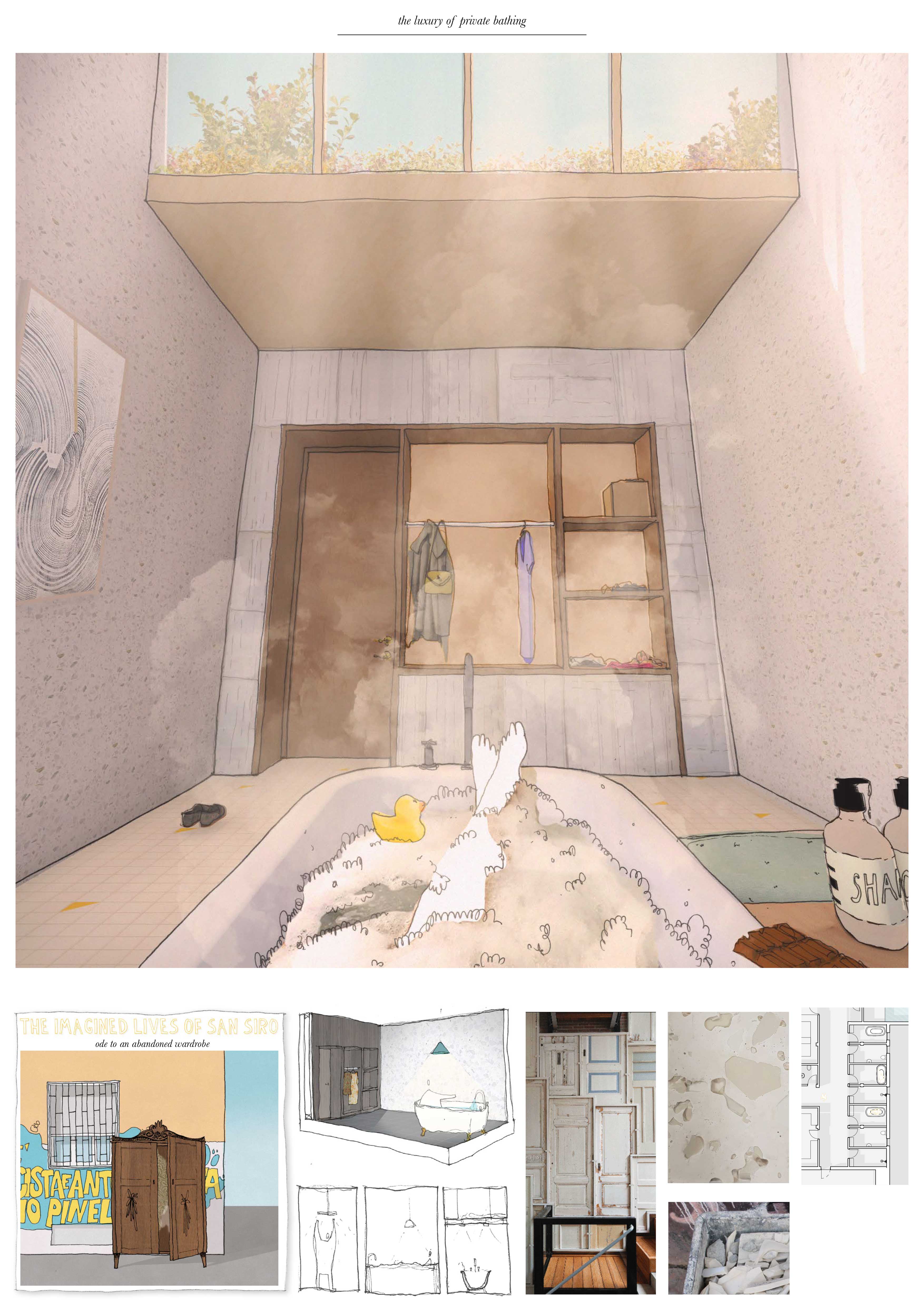 Musing on ‘everydayness’ and the squeezed modernist space standards underpinning San Siro, the project speculates on the creation of a new ‘neighbourhood luxury’; taking the functions of the everyday and elevating them to become spatially and temporally luxurious. Drawing from the context, three forms of luxury are conceptualised – dining, bathing, and imagining – each interpreted in multiple forms of private, semi-private, and collective luxury. These begin to alter the rigid urban grain of San Siro, deconstructing and reinhabiting a pair of concrete frames, and redefining a new street edge – announcing the gift of time and space for the everyday back to the residents of San Siro.