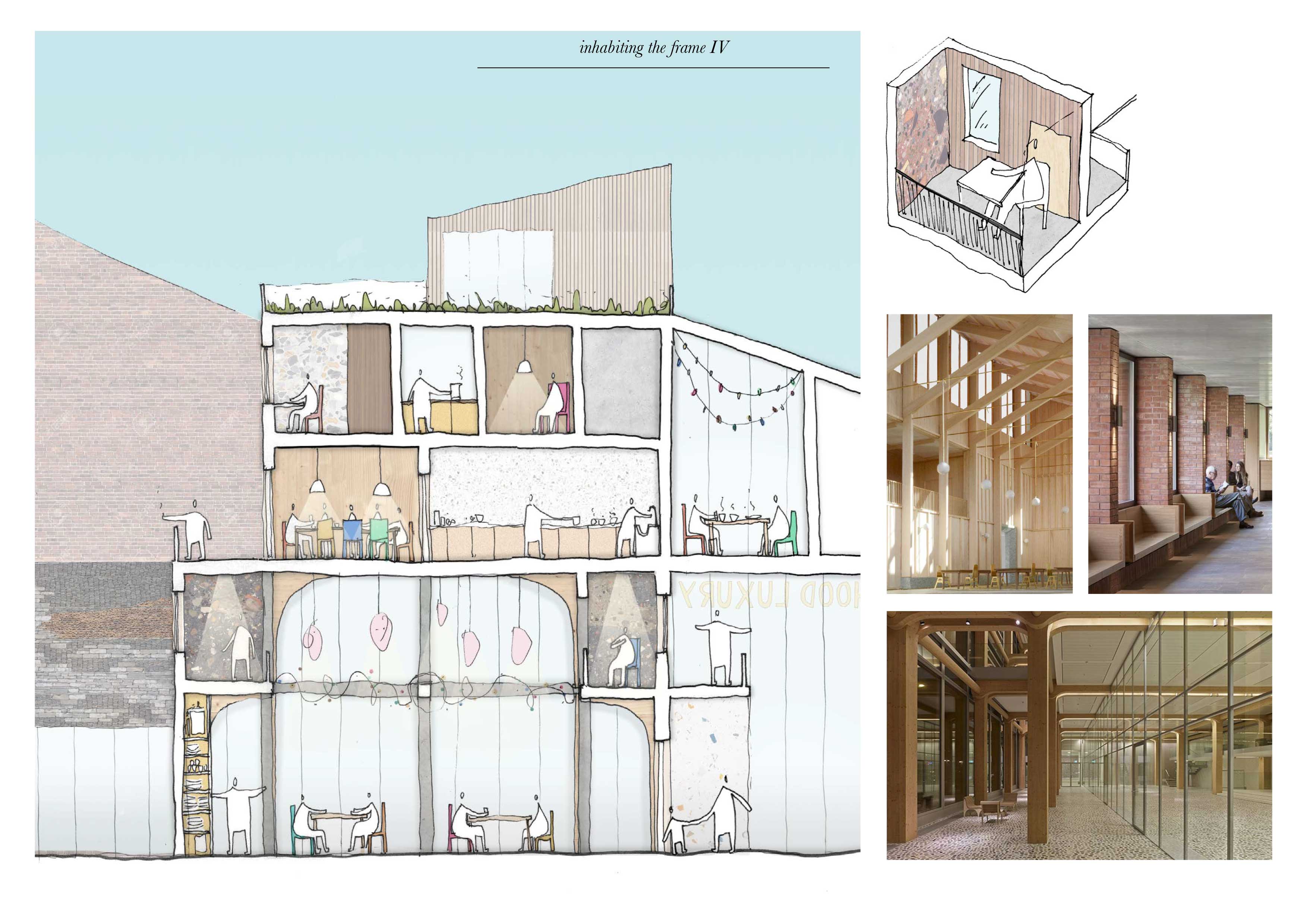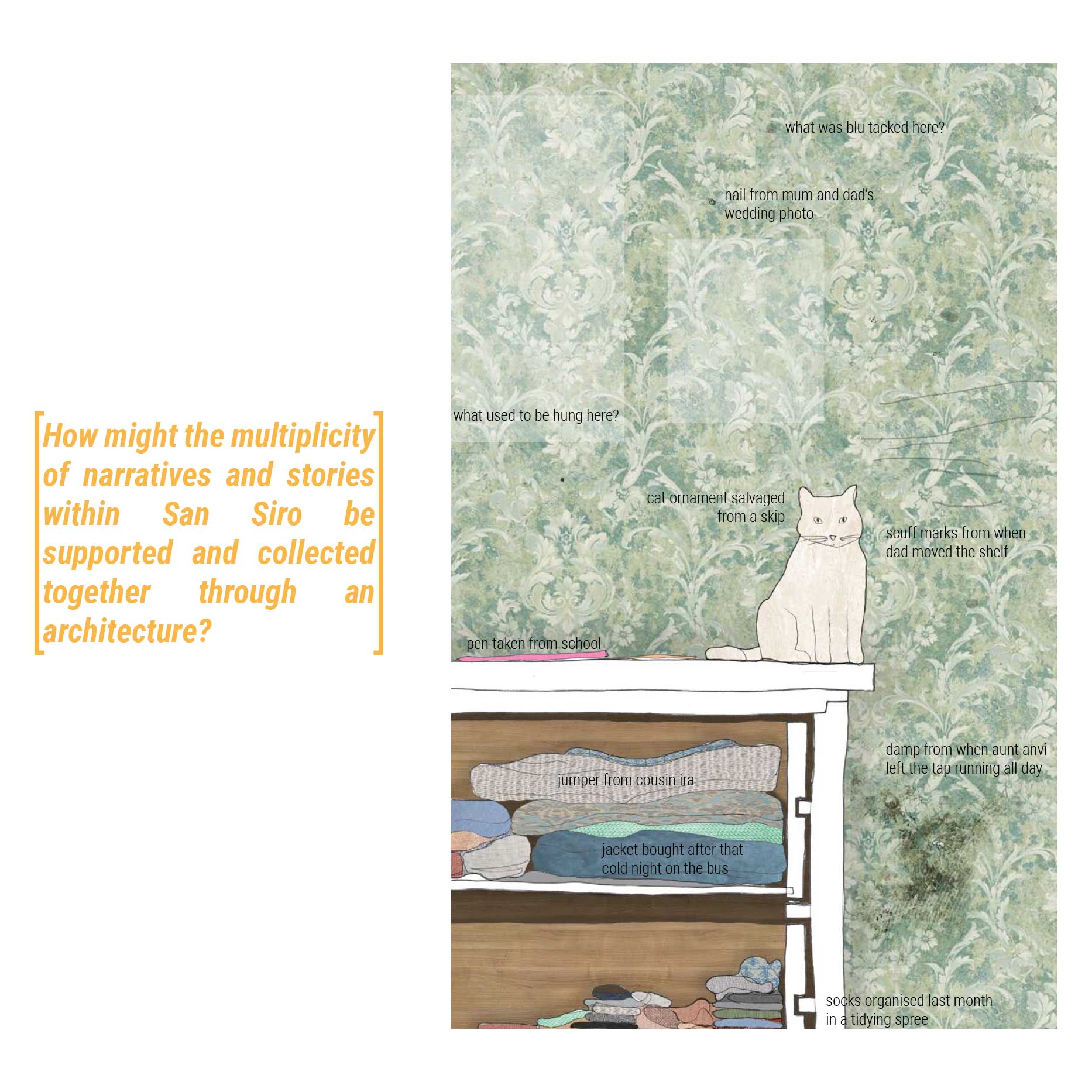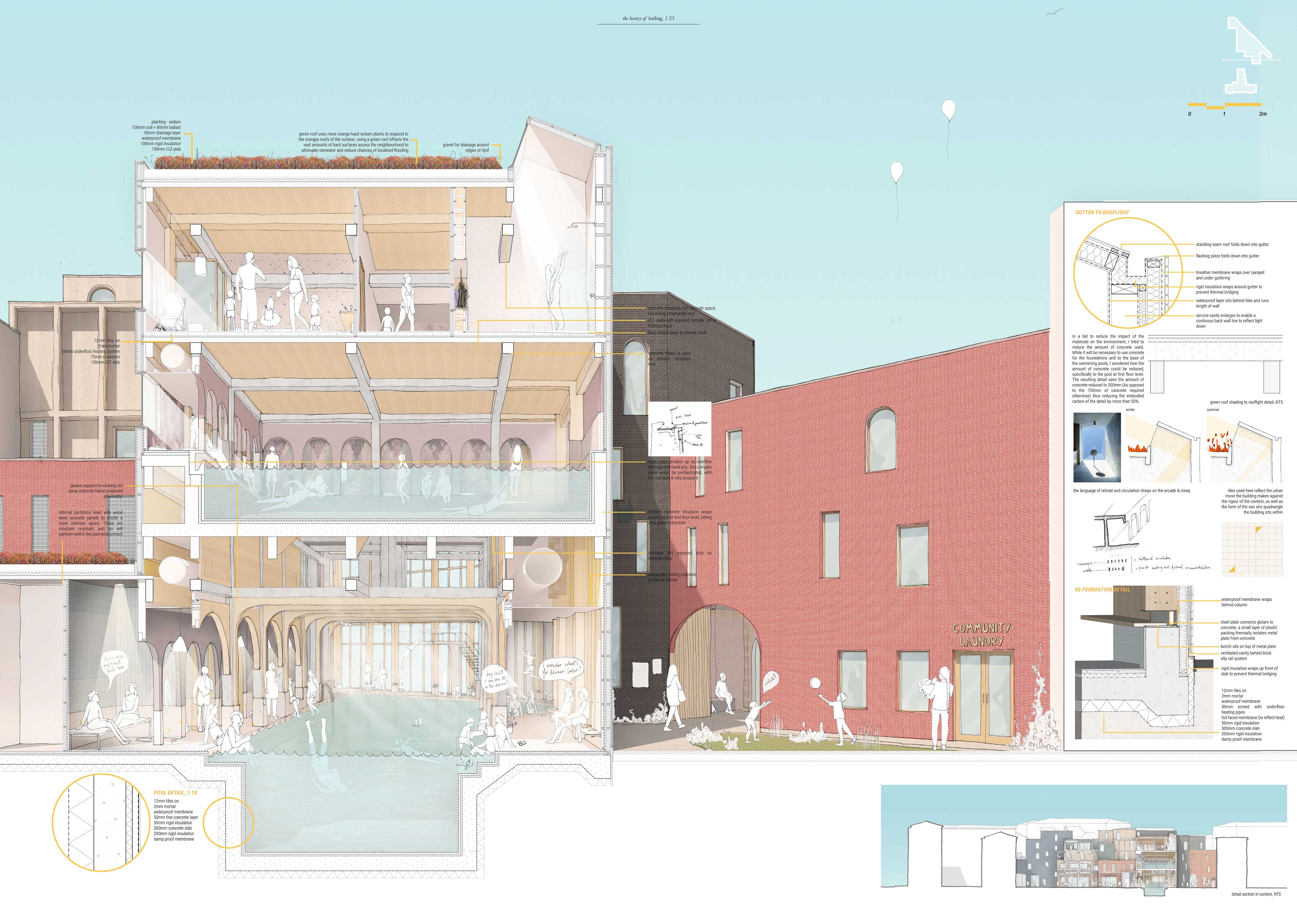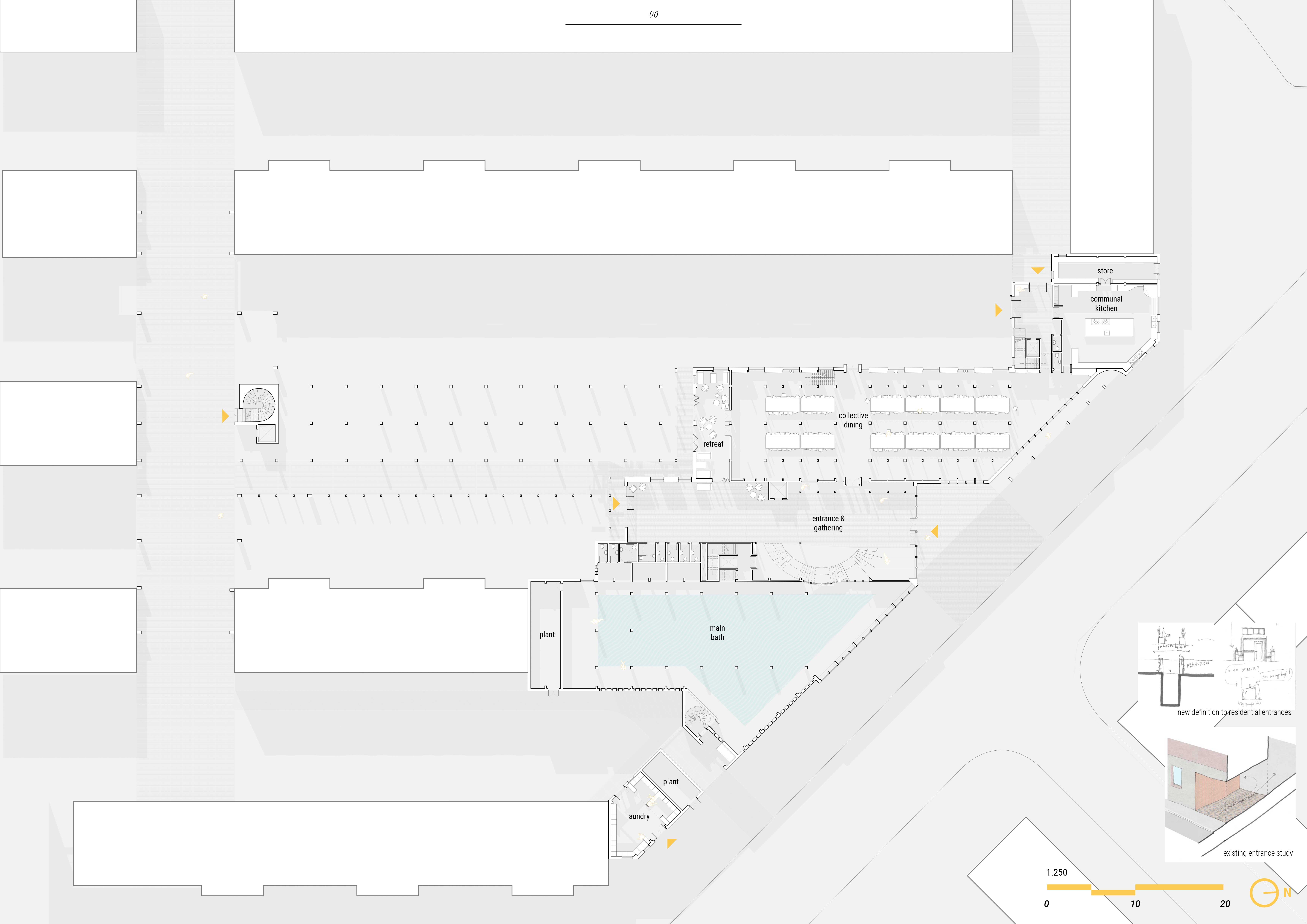 Musing on ‘everydayness’ and the squeezed modernist space standards underpinning San Siro, the project speculates on the creation of a new ‘neighbourhood luxury’; taking the functions of the everyday and elevating them to become spatially and temporally luxurious. Drawing from the context, three forms of luxury are conceptualised – dining, bathing, and imagining – each interpreted in multiple forms of private, semi-private, and collective luxury. These begin to alter the rigid urban grain of San Siro, deconstructing and reinhabiting a pair of concrete frames, and redefining a new street edge – announcing the gift of time and space for the everyday back to the residents of San Siro.