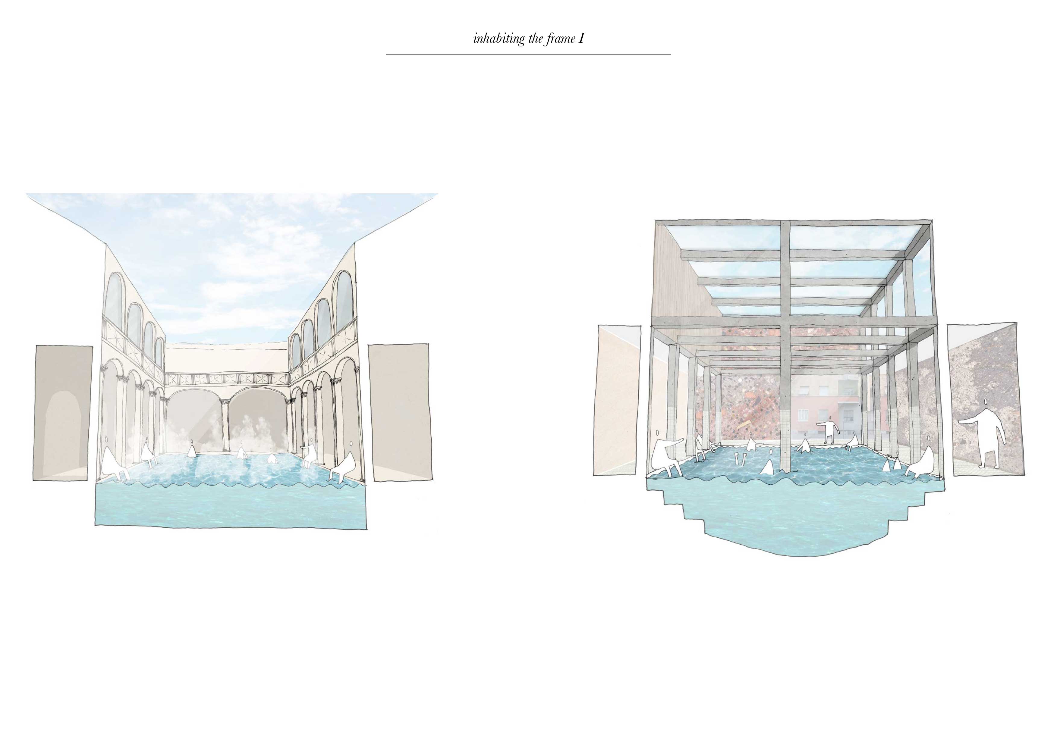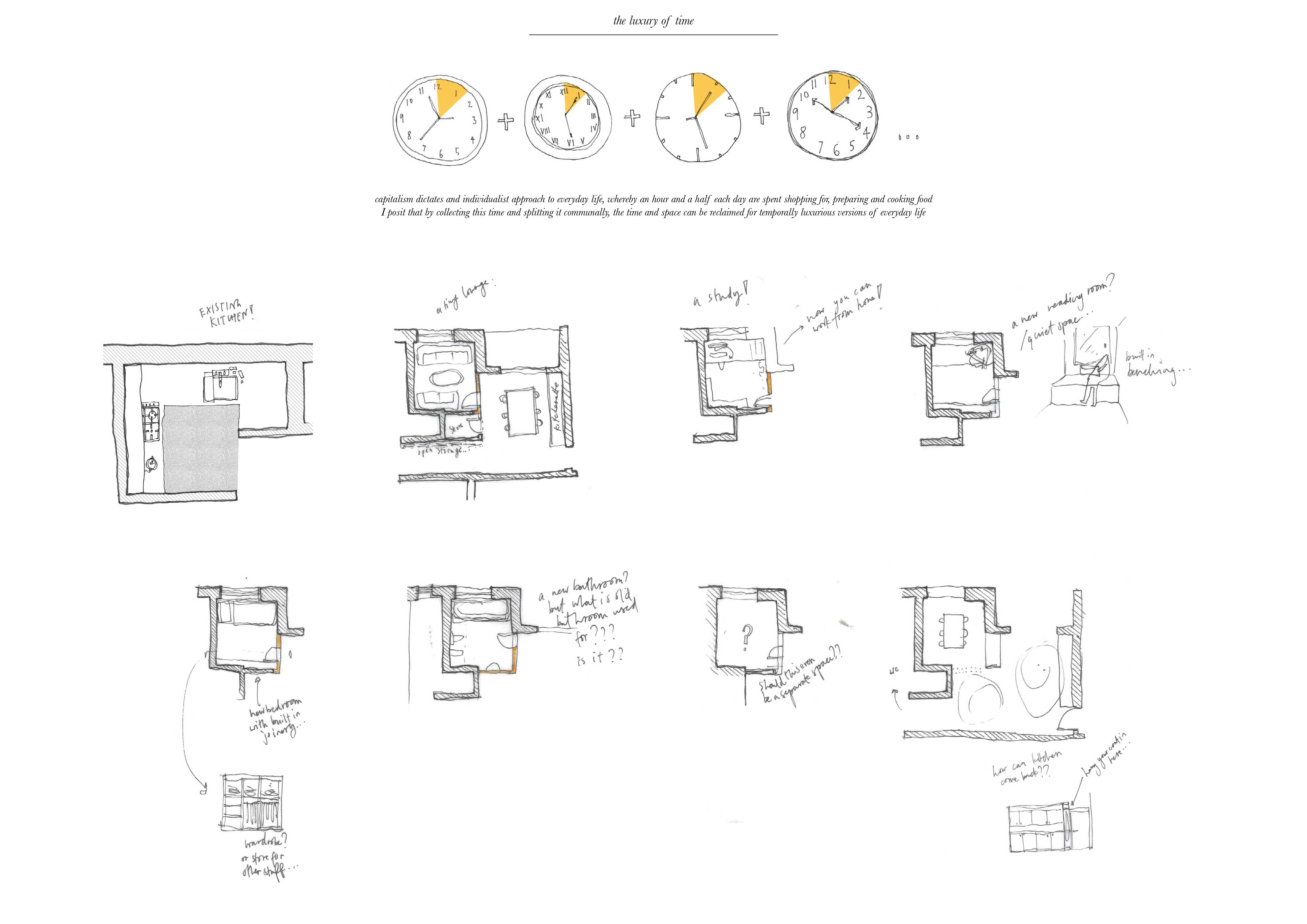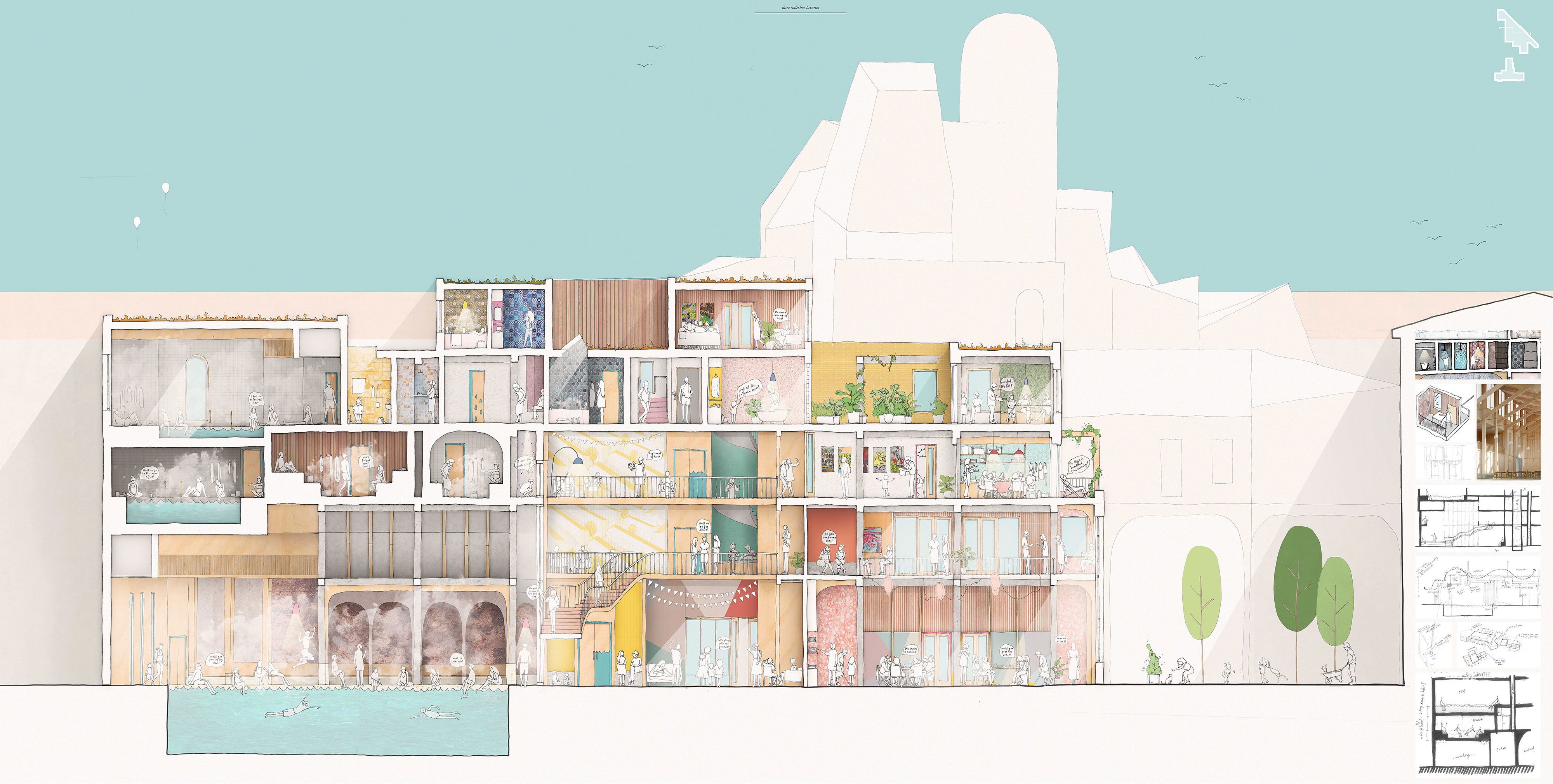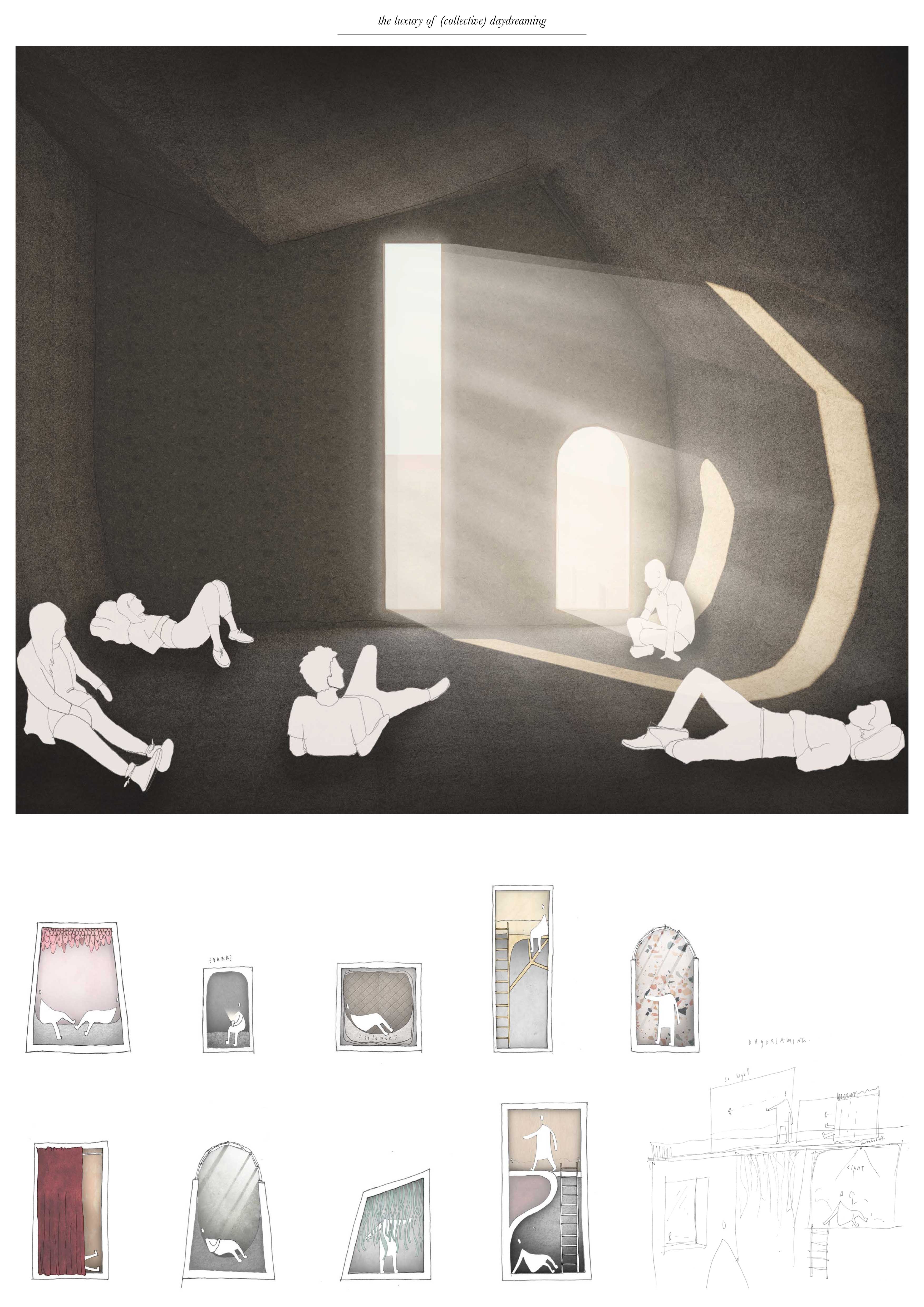 Musing on ‘everydayness’ and the squeezed modernist space standards underpinning San Siro, the project speculates on the creation of a new ‘neighbourhood luxury’; taking the functions of the everyday and elevating them to become spatially and temporally luxurious. Drawing from the context, three forms of luxury are conceptualised – dining, bathing, and imagining – each interpreted in multiple forms of private, semi-private, and collective luxury. These begin to alter the rigid urban grain of San Siro, deconstructing and reinhabiting a pair of concrete frames, and redefining a new street edge – announcing the gift of time and space for the everyday back to the residents of San Siro.