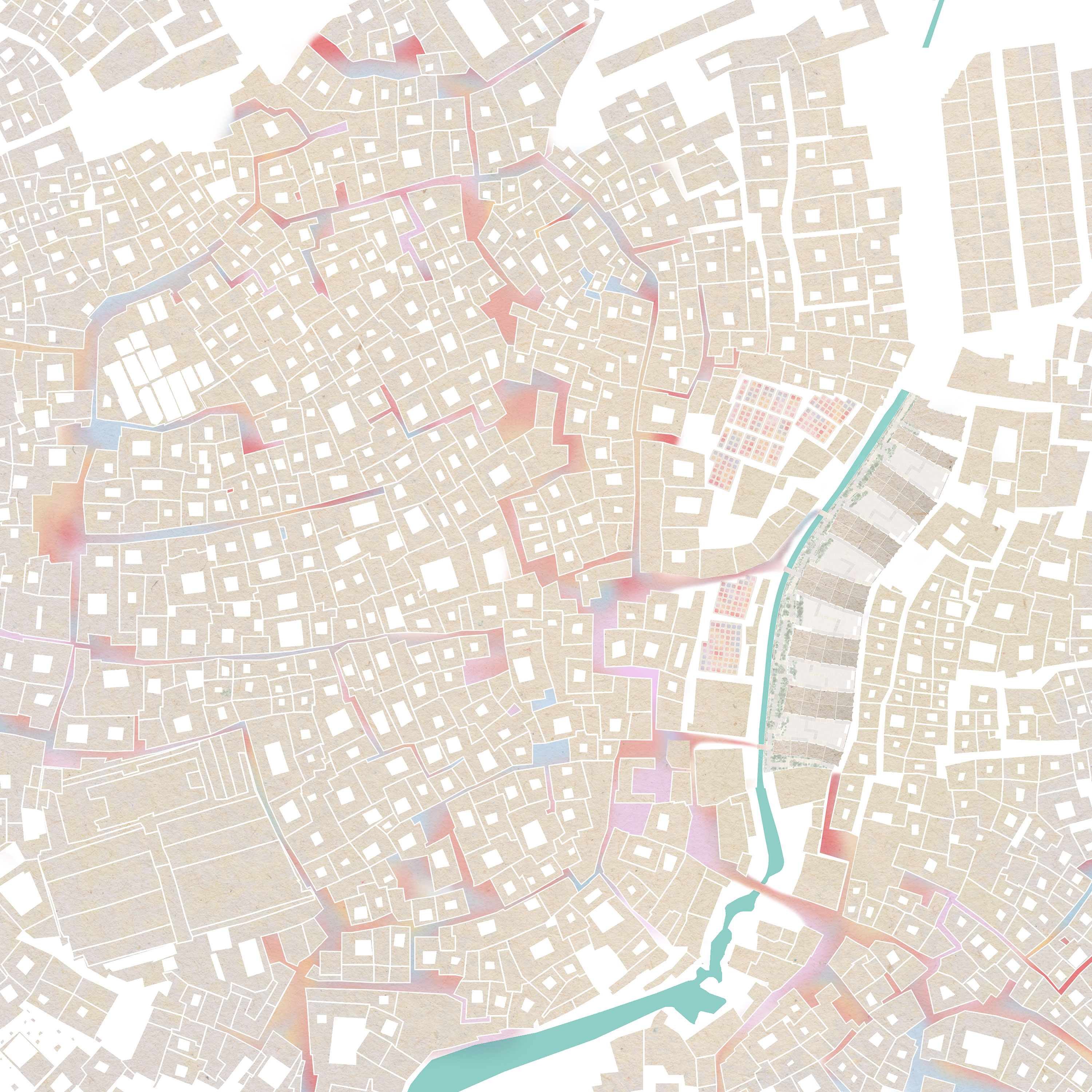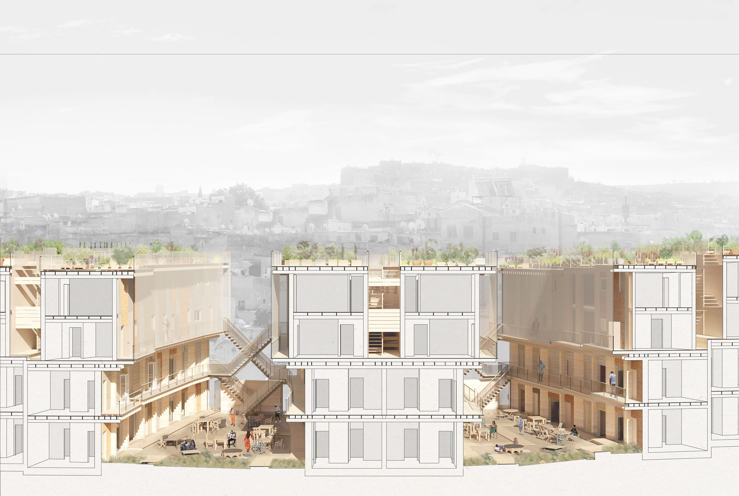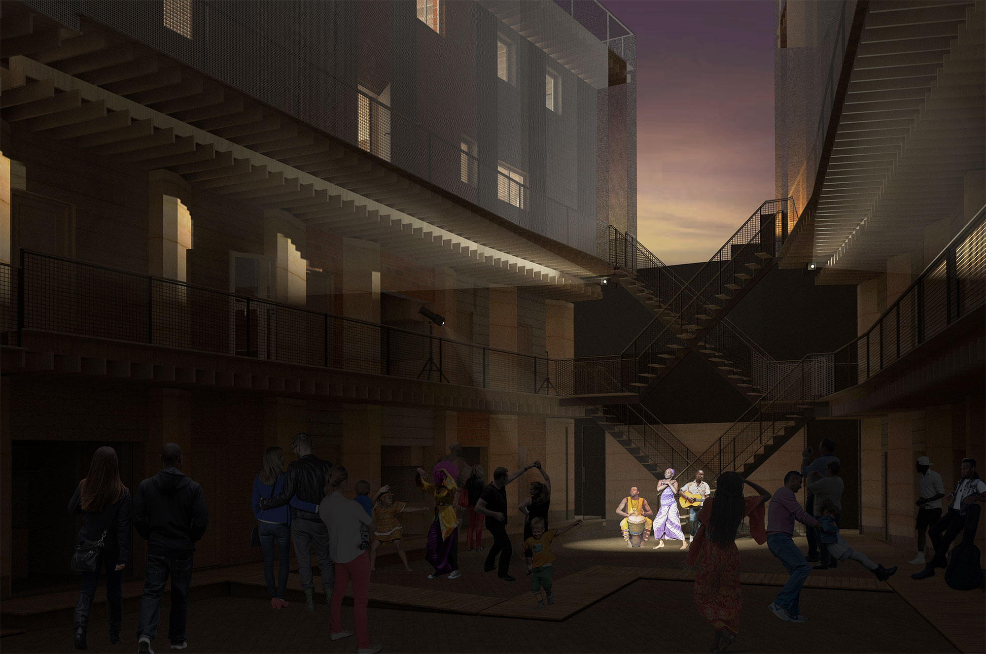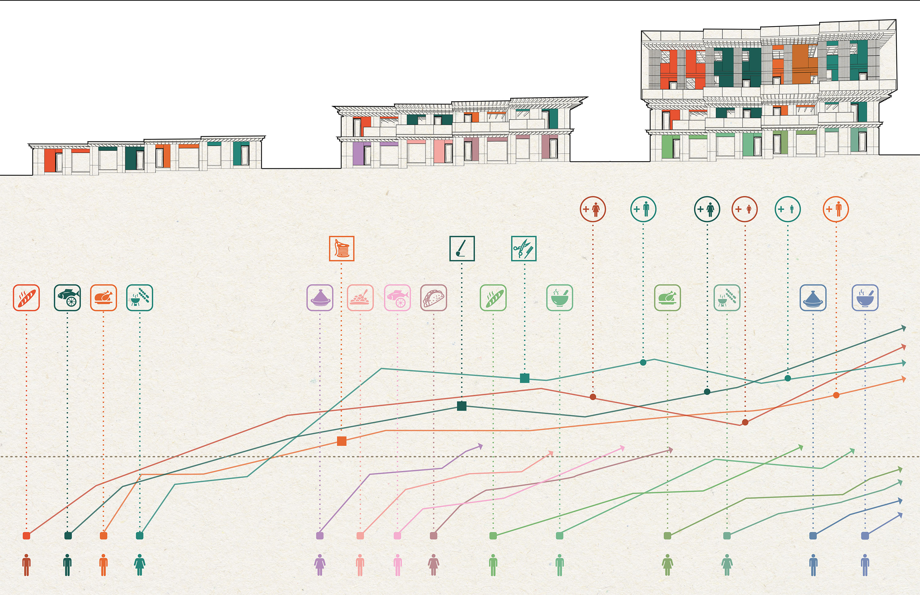 migrant agenda led me to Morocco, the point of departure from Africa for some West African migrants but increasingly also a final destination. A phased approach exhibited the social mobility of a migrant community. Beginning with work/ live units serving the food of West Africa. The project allows for changes in profession, increasing family size and the support of a larger migrant community through further work/ live units and public outdoor spaces. Through a self build framework the building itself becomes a manifestation of the human endeavour often demonised as economic migration.