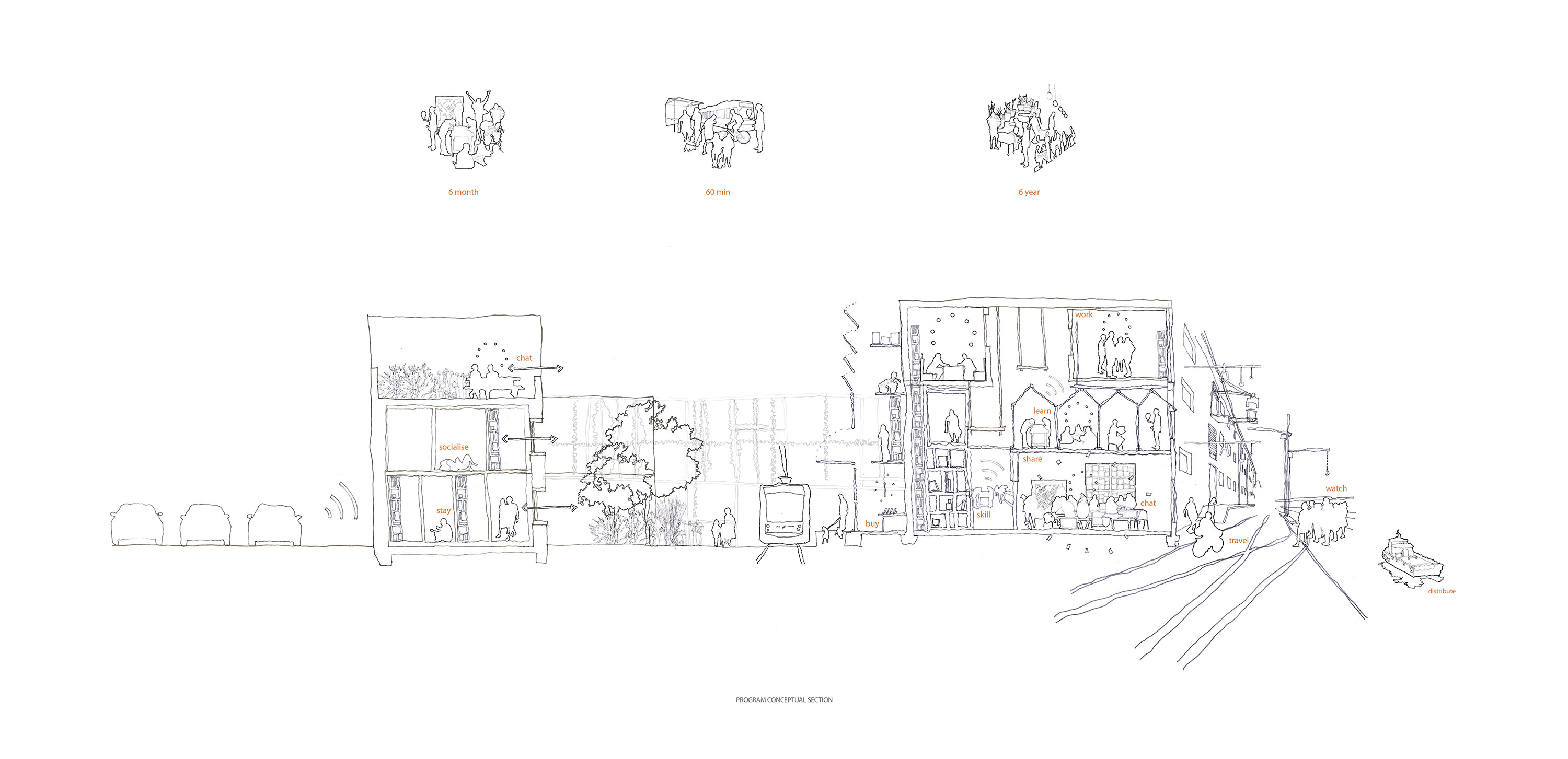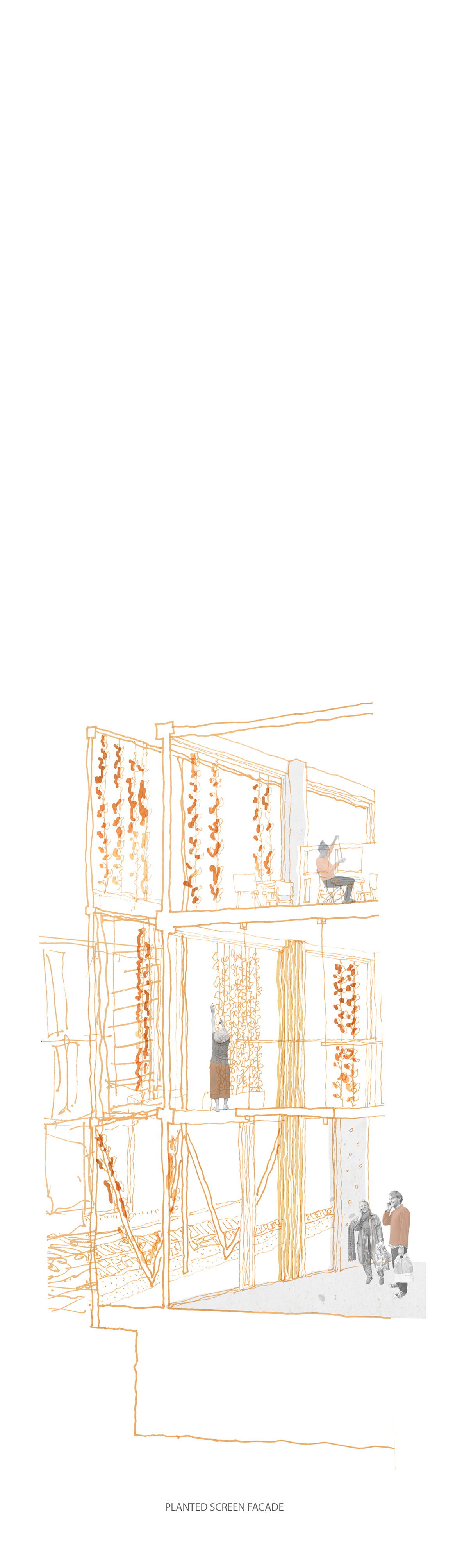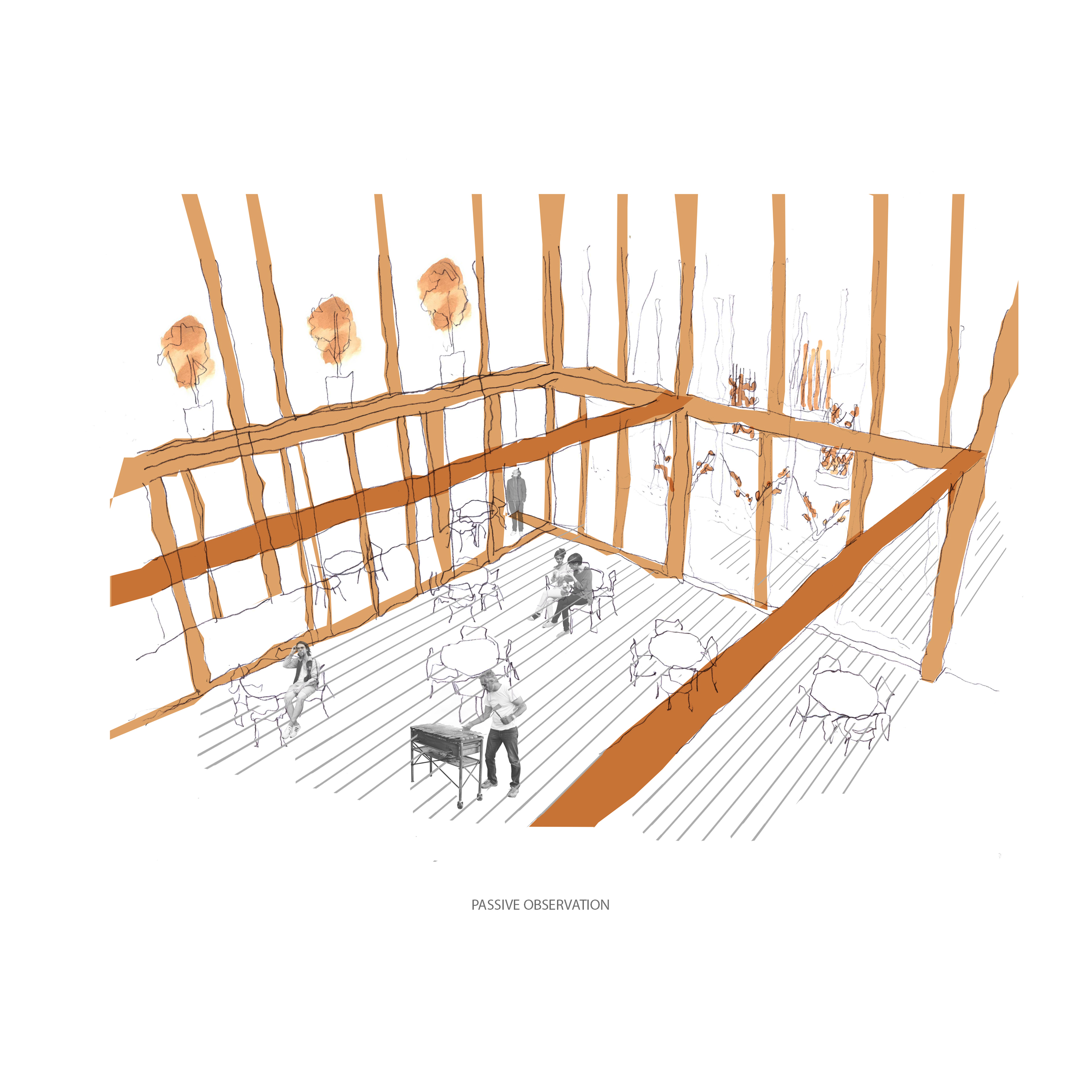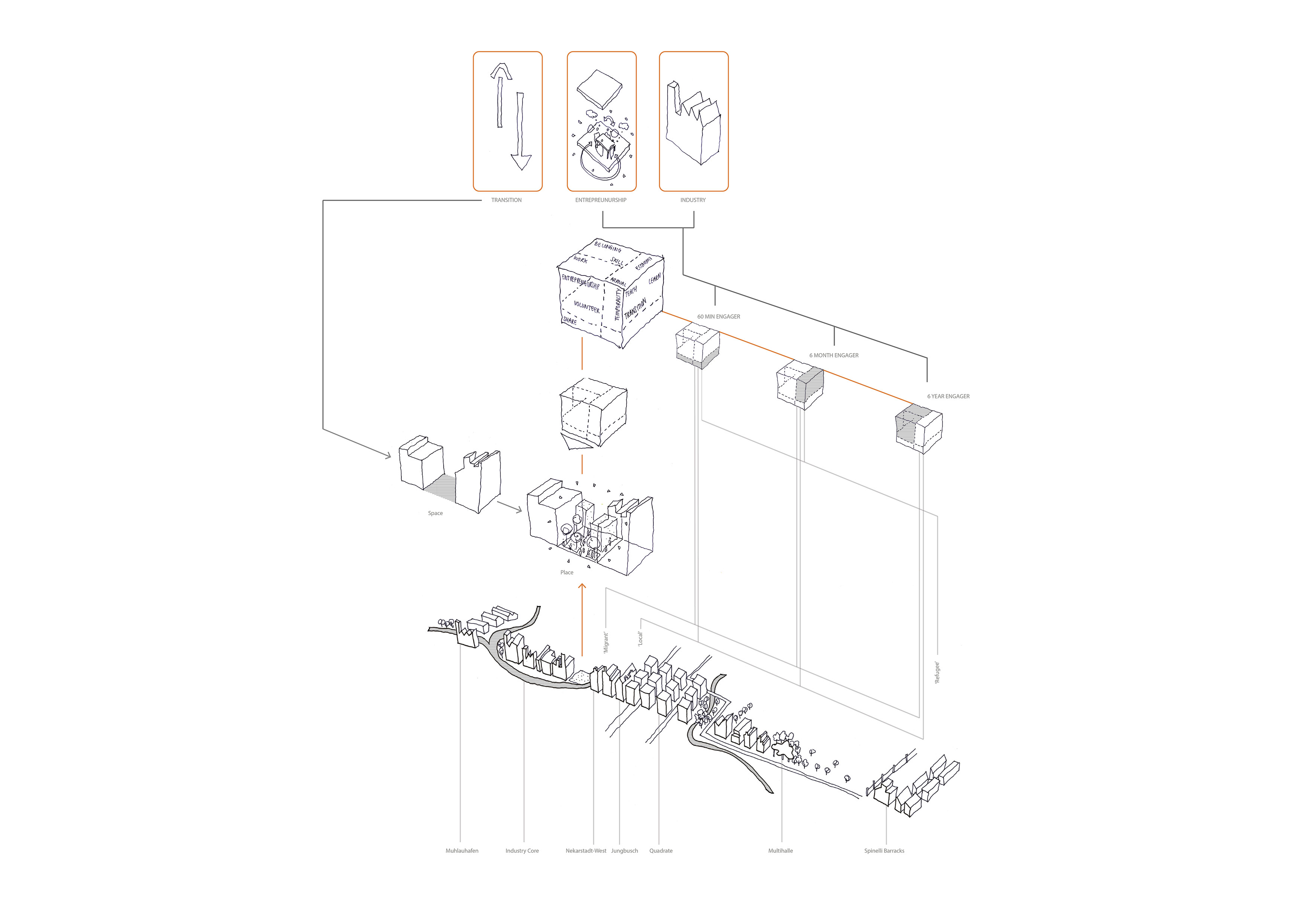 The project uses entrepreneurship and micro industry as an engine of integration by providing a platform for skill, language and economic advancement. Aiming to tackle social barriers to integration through participation by providing places for different types of people to meet which encourage communication and cultural exchanges. A place for refugees, migrants and non-migrants, for the 60 minute engager, the 6 month engager and the 6 year engager in order to maximise interaction and transition. Key themes of permeability, diversity and a spectrum of spaces, derived from research into a guidance framework for the transformation of vacant spaces into places which would aid the integration of migrant communities, informed key programmatic and architectural approaches.