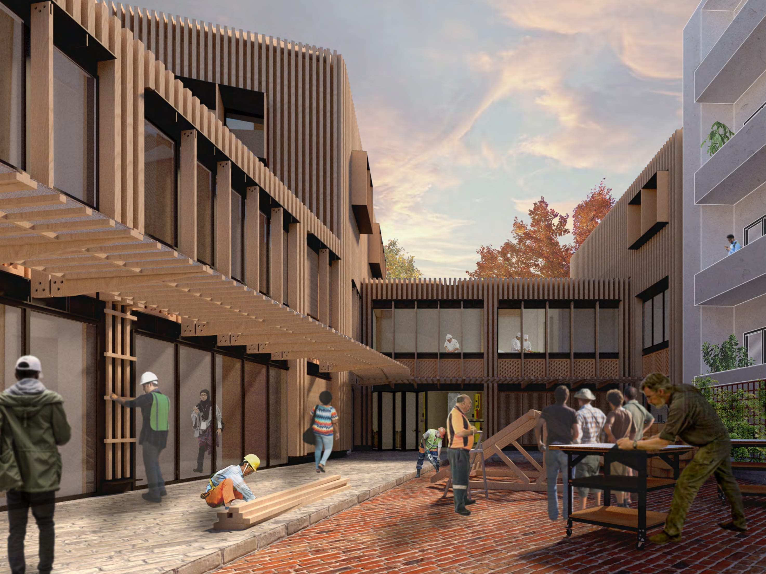 In response to gentrification and lack of entrepreneurial opportunities threatening to stagnate the arrival neighbourhood of Neckarstadt-West, Mannheim, the scheme proposes a community-owned adult education and enterprise centre providing accessible and vocational skills along with the framework in which they can be applied. Imagined as a community-driven social enterprise, users can learn skills while also having the opportunity to put them to use as the centre expands, whether that be in a self-build capacity or inhabiting new work and business spaces.