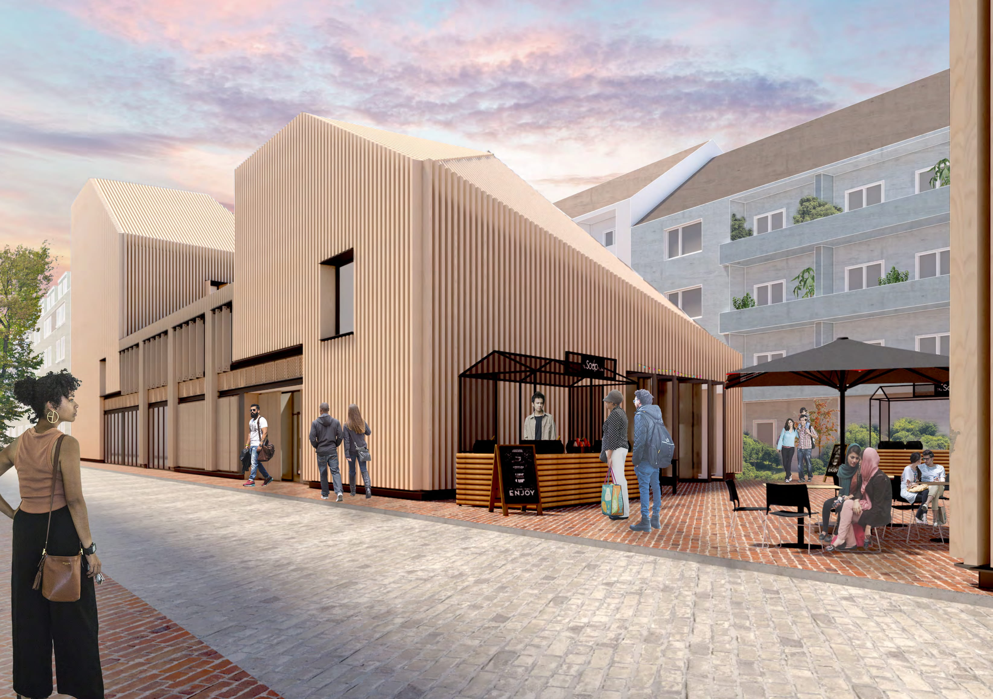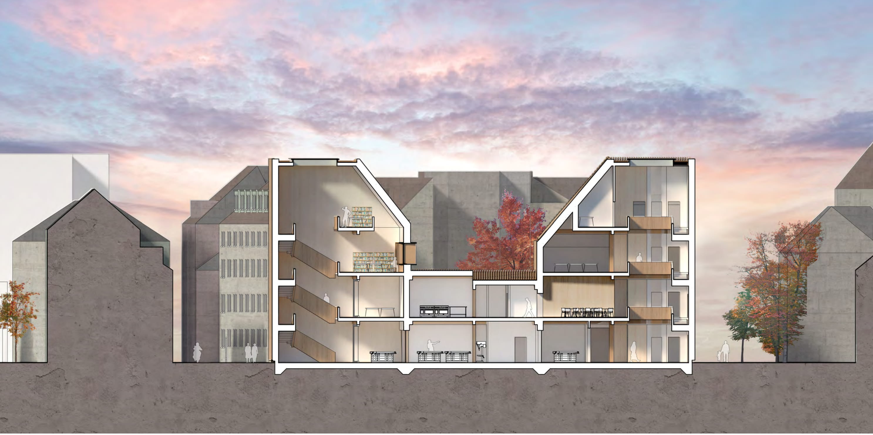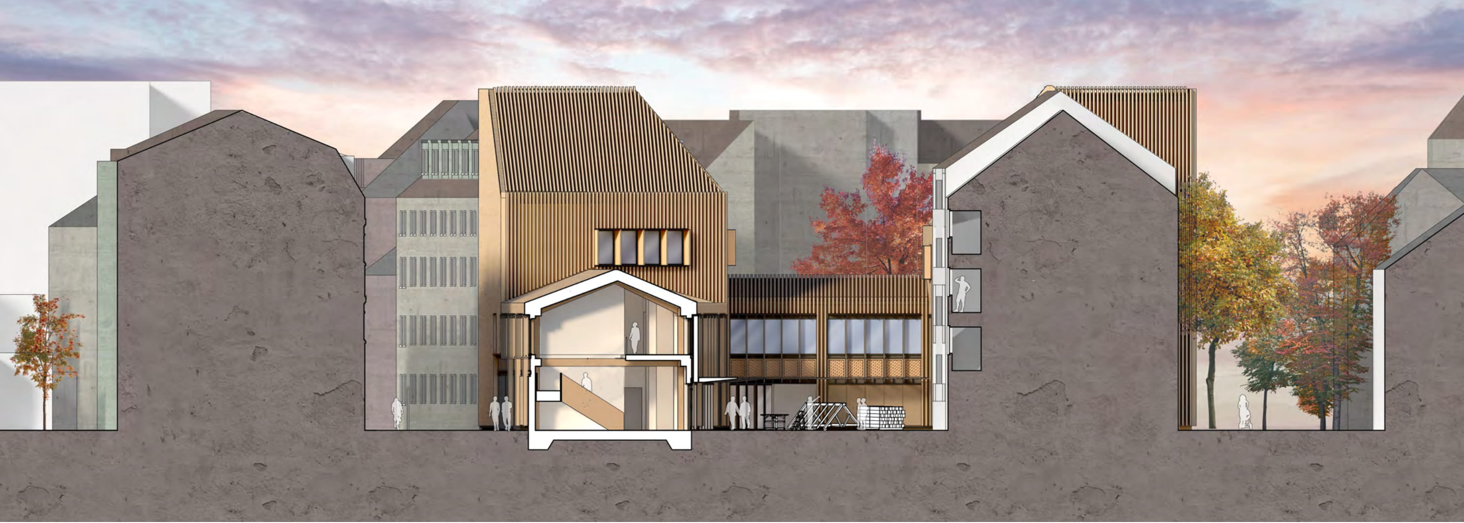 A dense residential context drives the form of the building with chamfered, top-lit masses developed in response to the proximity of residential windows and balconies, reducing both overlooking and overshadowing. The scheme takes advantage of the cities proximity to the ‘Black Forest’ providing a huge supply of timber products, that heavily influences a materiality that also aims to embody the core values and craft based, accessible uses that the building offers.