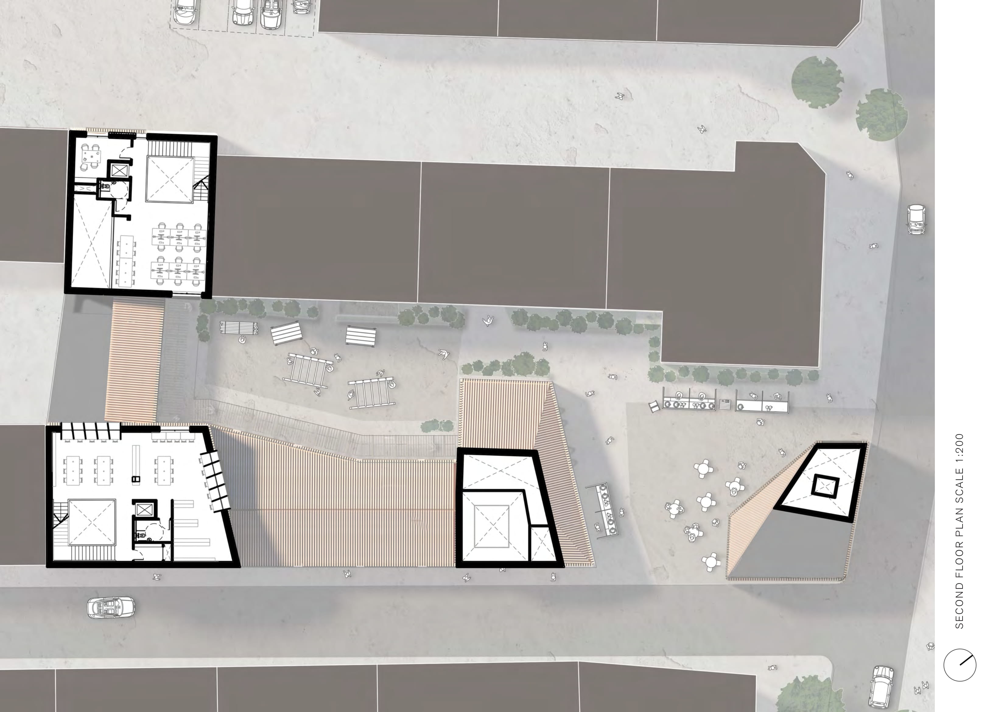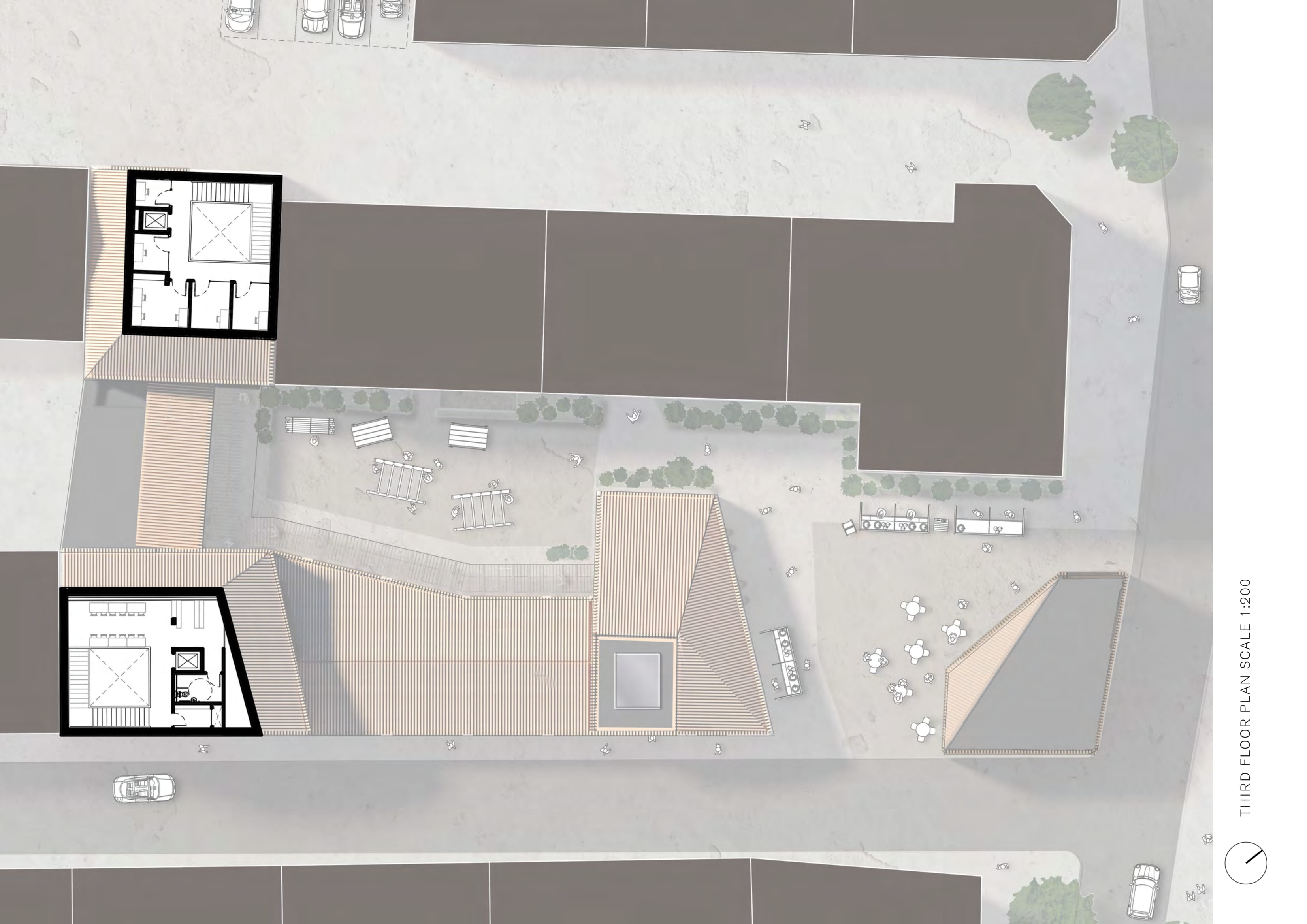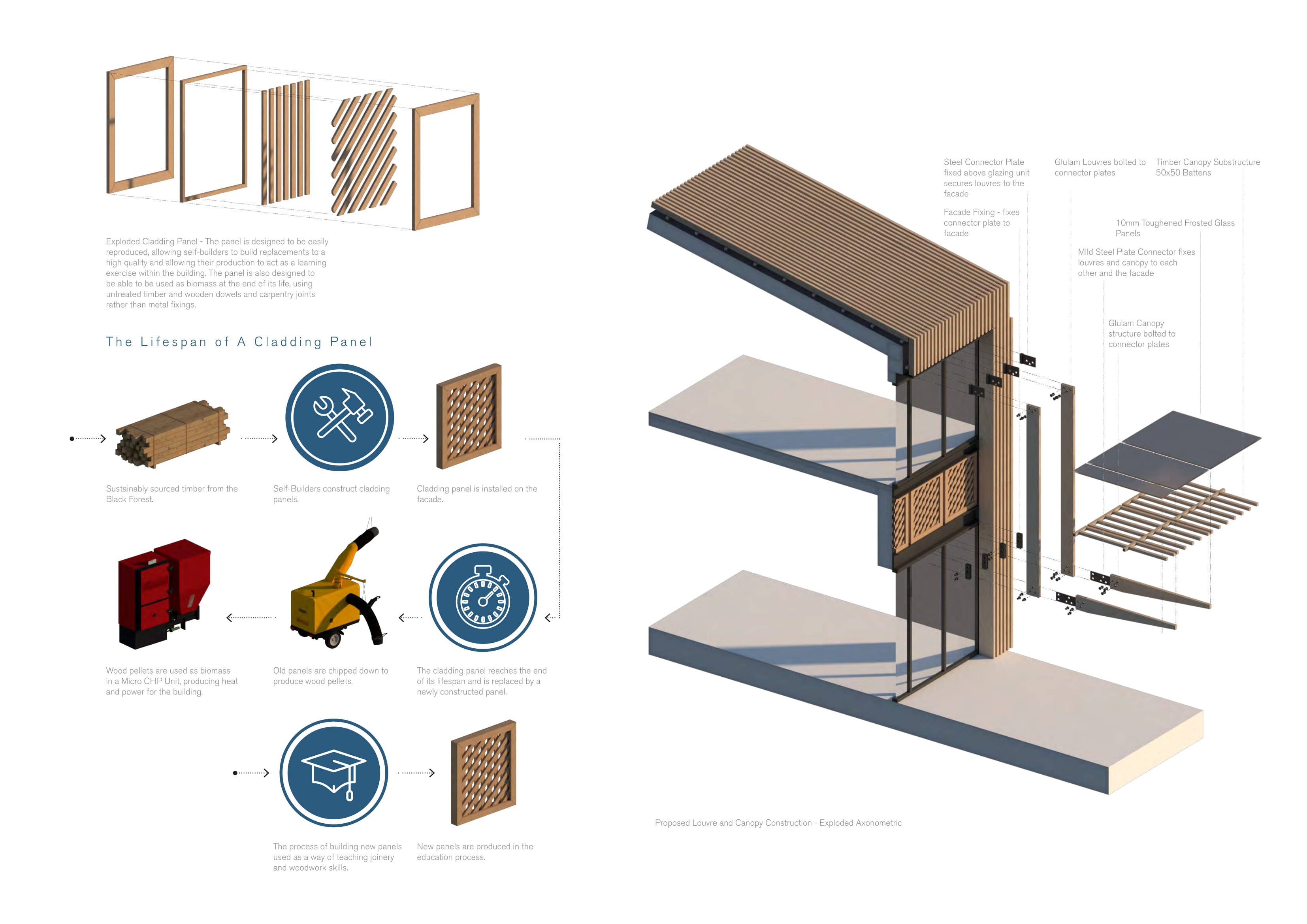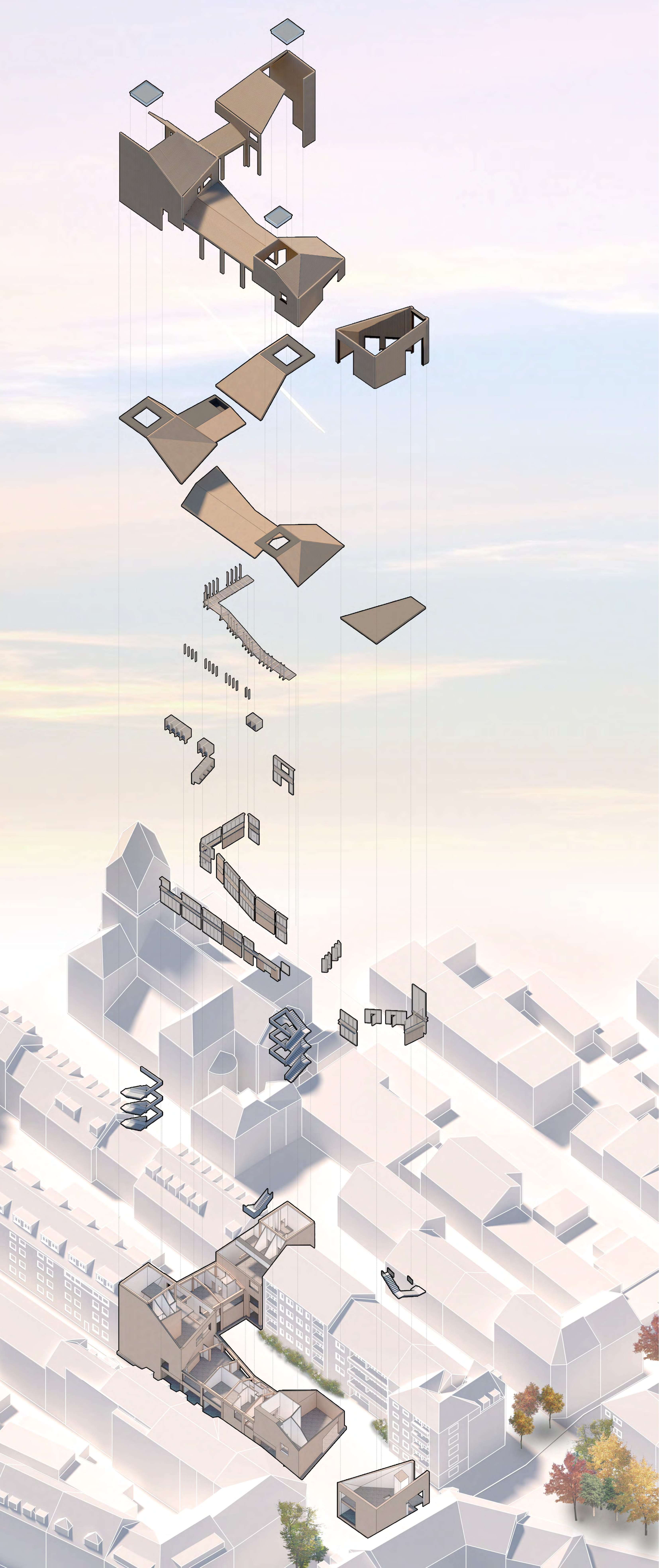 A dense residential context drives the form of the building with chamfered, top-lit masses developed in response to the proximity of residential windows and balconies, reducing both overlooking and overshadowing. The scheme takes advantage of the cities proximity to the ‘Black Forest’ providing a huge supply of timber products, that heavily influences a materiality that also aims to embody the core values and craft based, accessible uses that the building offers.