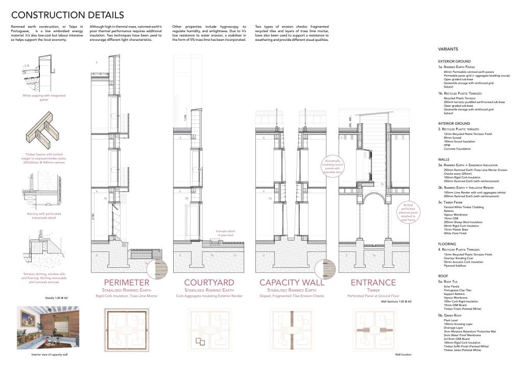 Underpinning the entire project is the environmental strategy and the mitigation of affects caused by global temperature rises. Within the block, there are four distinct wall typologies comprising of locally sourced rammed earth and timber pine. Where temperatures can reach above 40c in the summer months, these walls are key in the support for comfortable habitable environments involving natural ventilation and suitable lighting, acoustics, heating and cooling. Green roofs, rainwater harvesting, grey-water collection and solar panels also support efficient usage within the building.