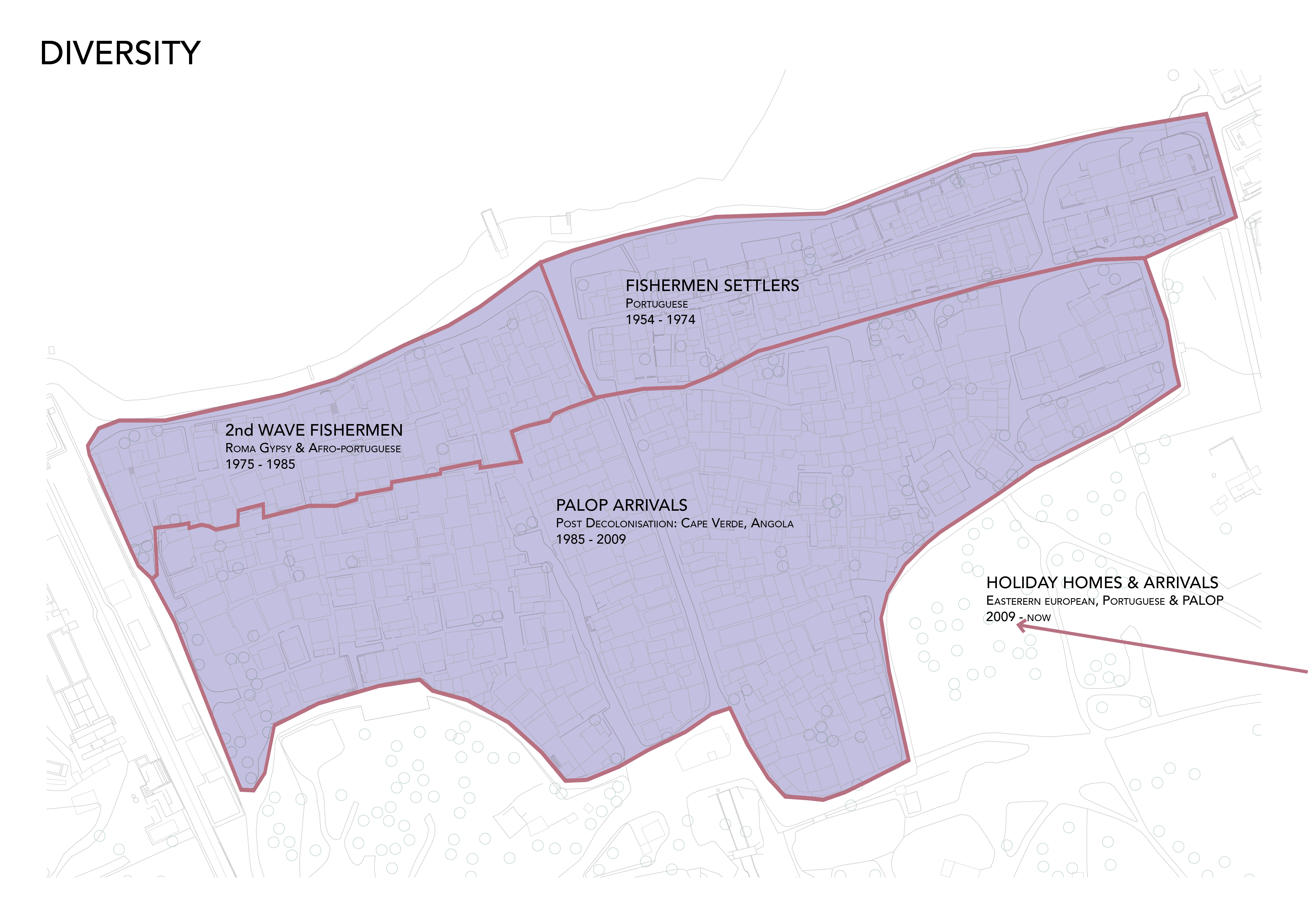 Terceiro Torrao, The Third Chunk, is a new mixed tenure neighbourhood on the south coast of the River Tagus. It is home to a variety of residents who previously faced climatic, political and/or economic displacement namely; the informal community of Segundo Torrao, The Second Chunk, and marginalised city dwellers.
