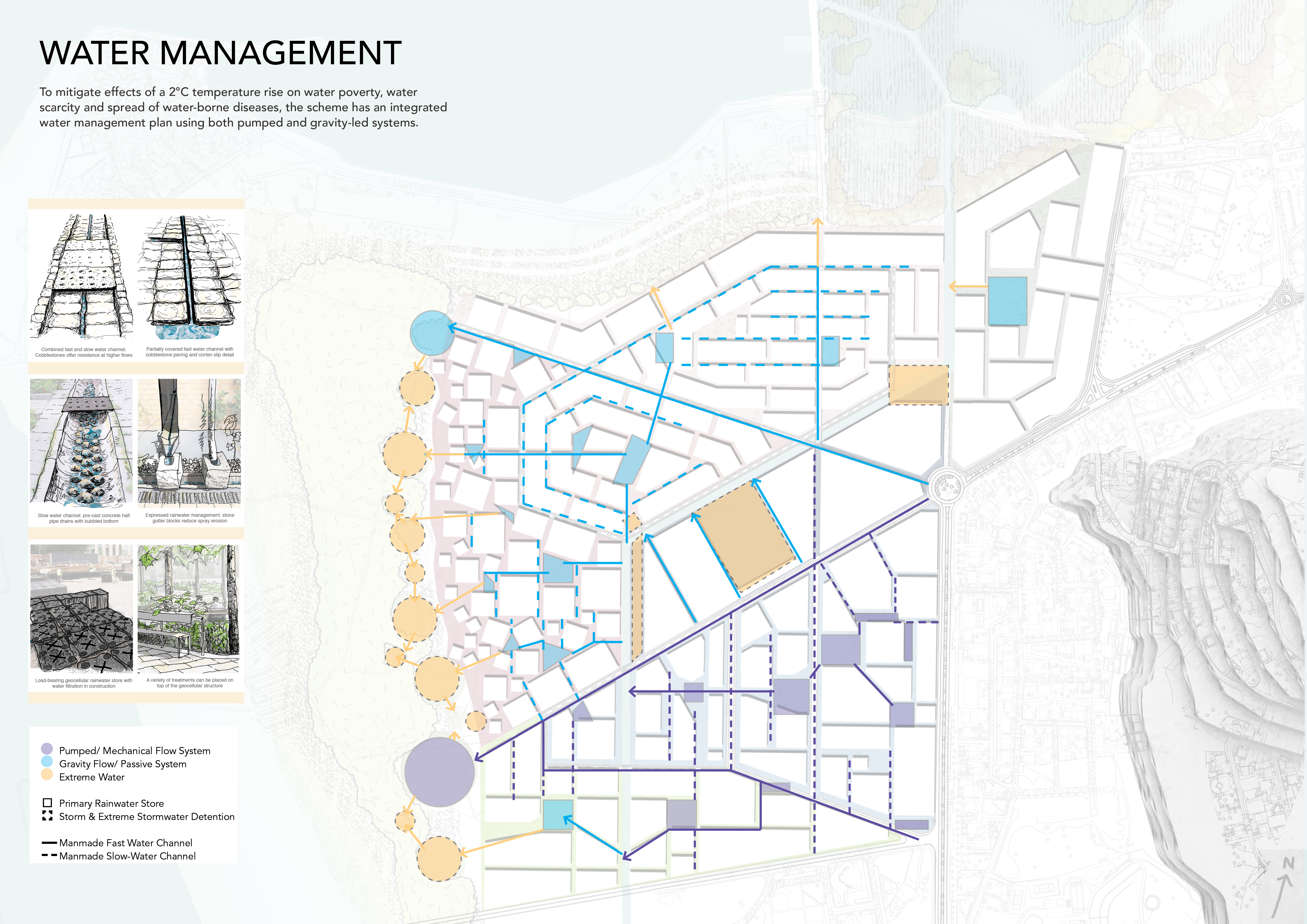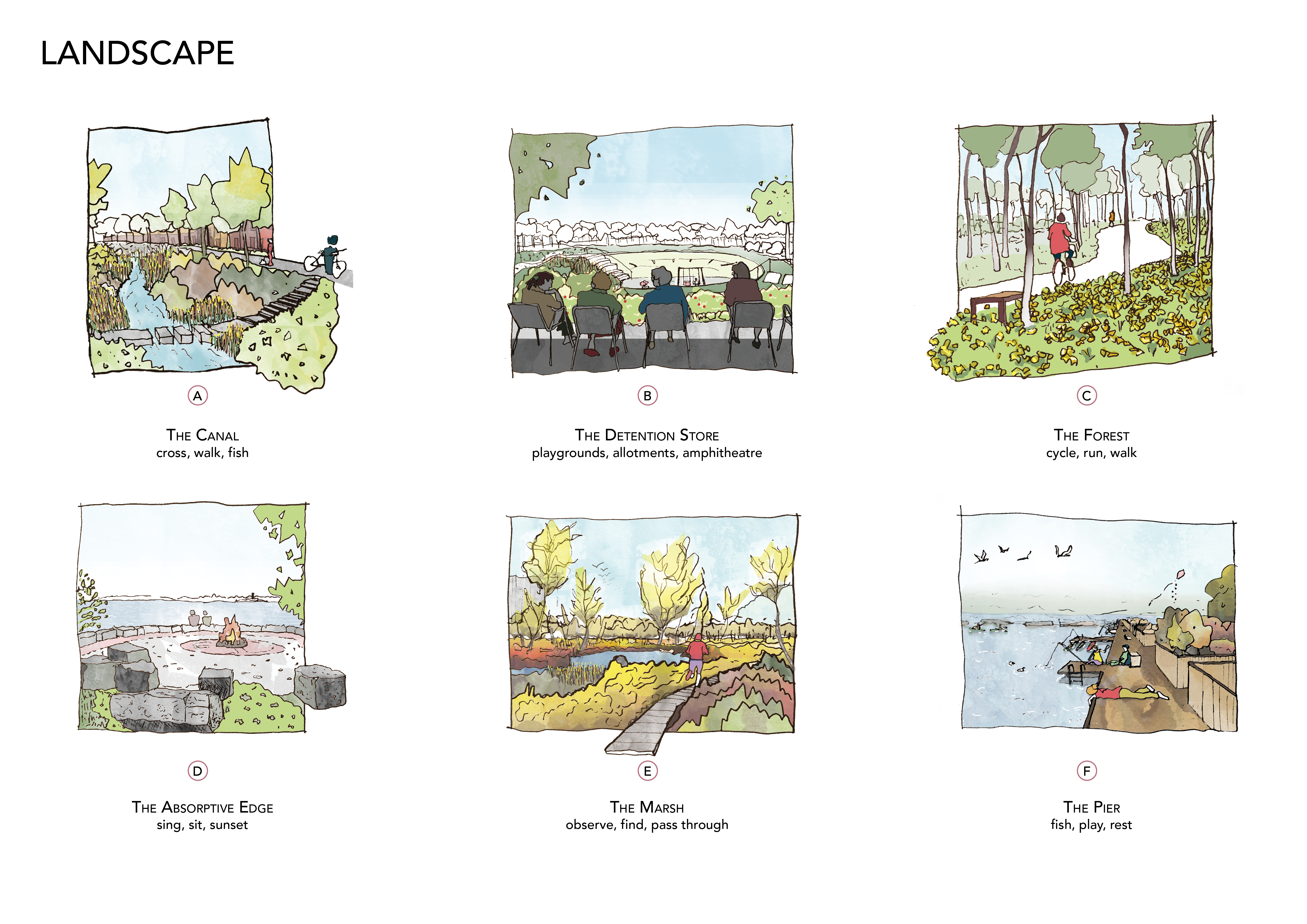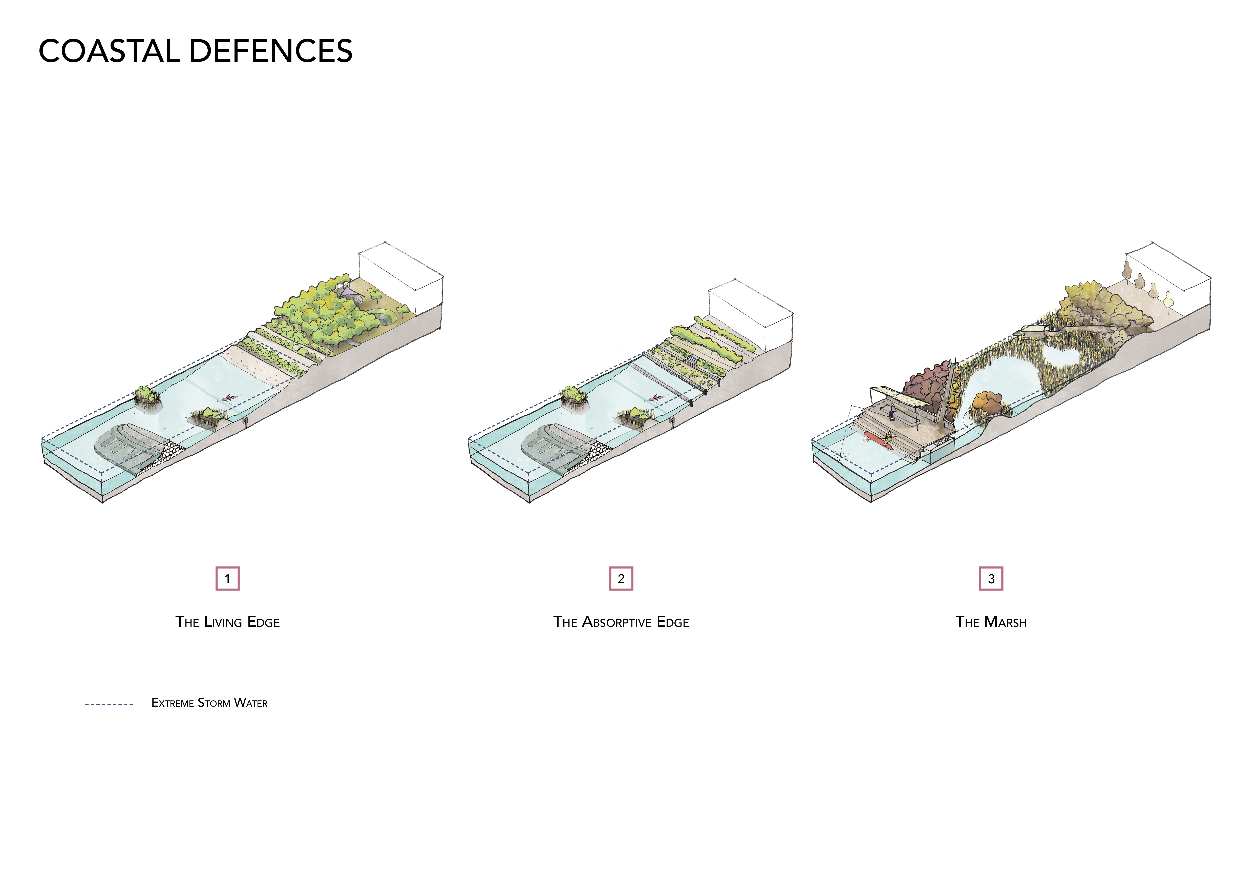 Across the site, further environmental tactics are used to create a resilient and caring environment. Varying coastal defence conditions, recreational zones and rainwater management strategies are celebrated and in doing so, the entire scheme becomes part of the ecosystem in which it sits.