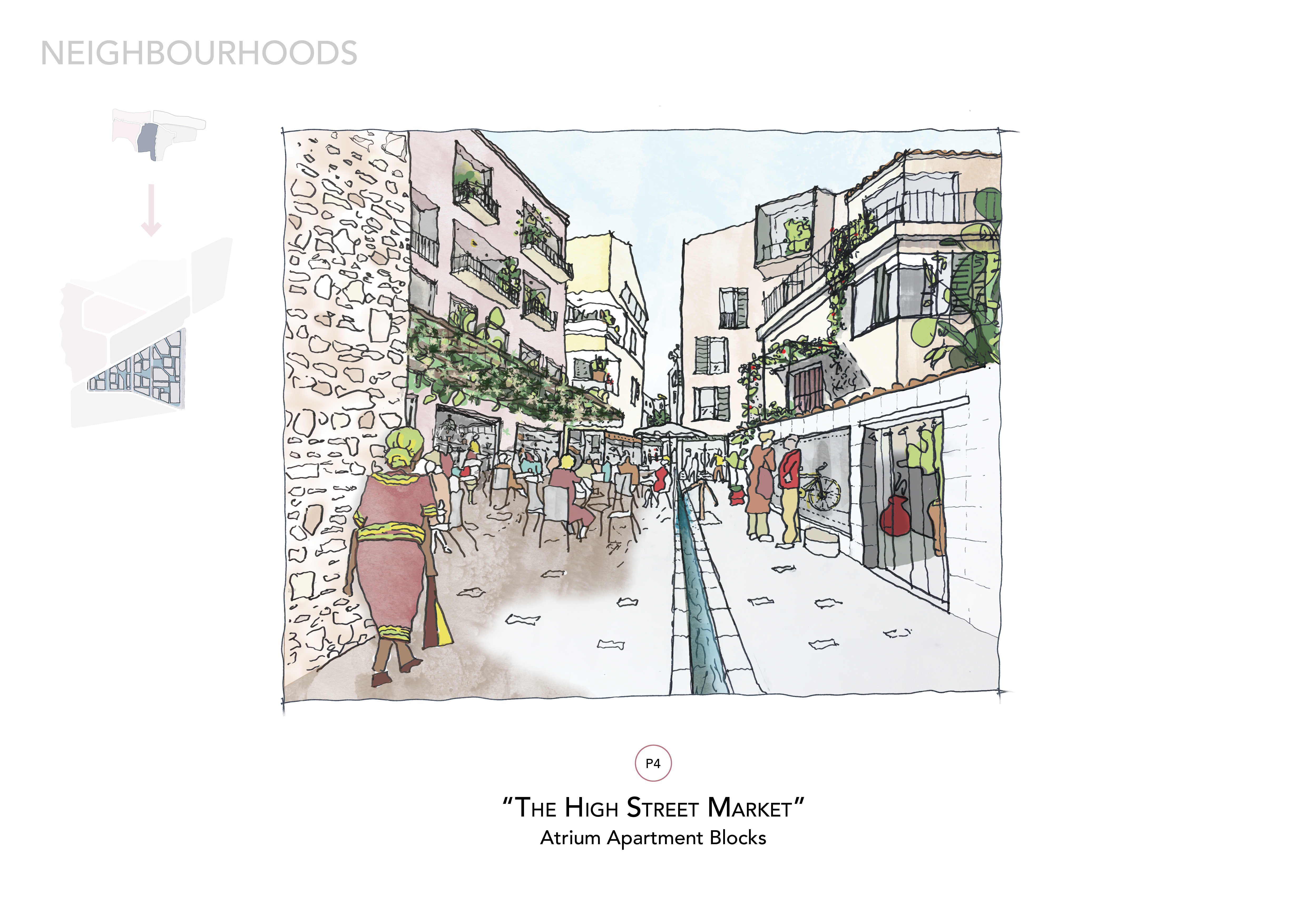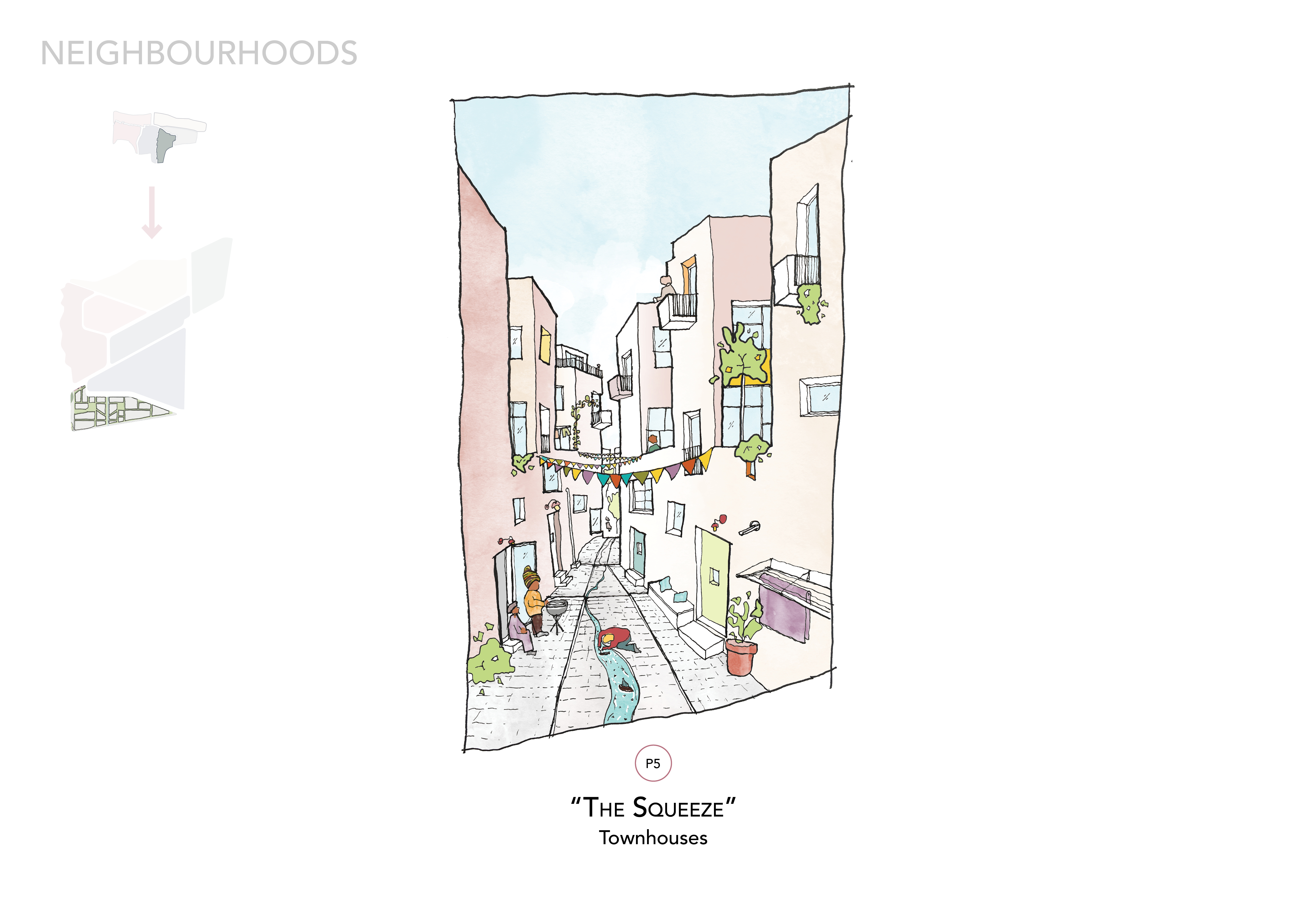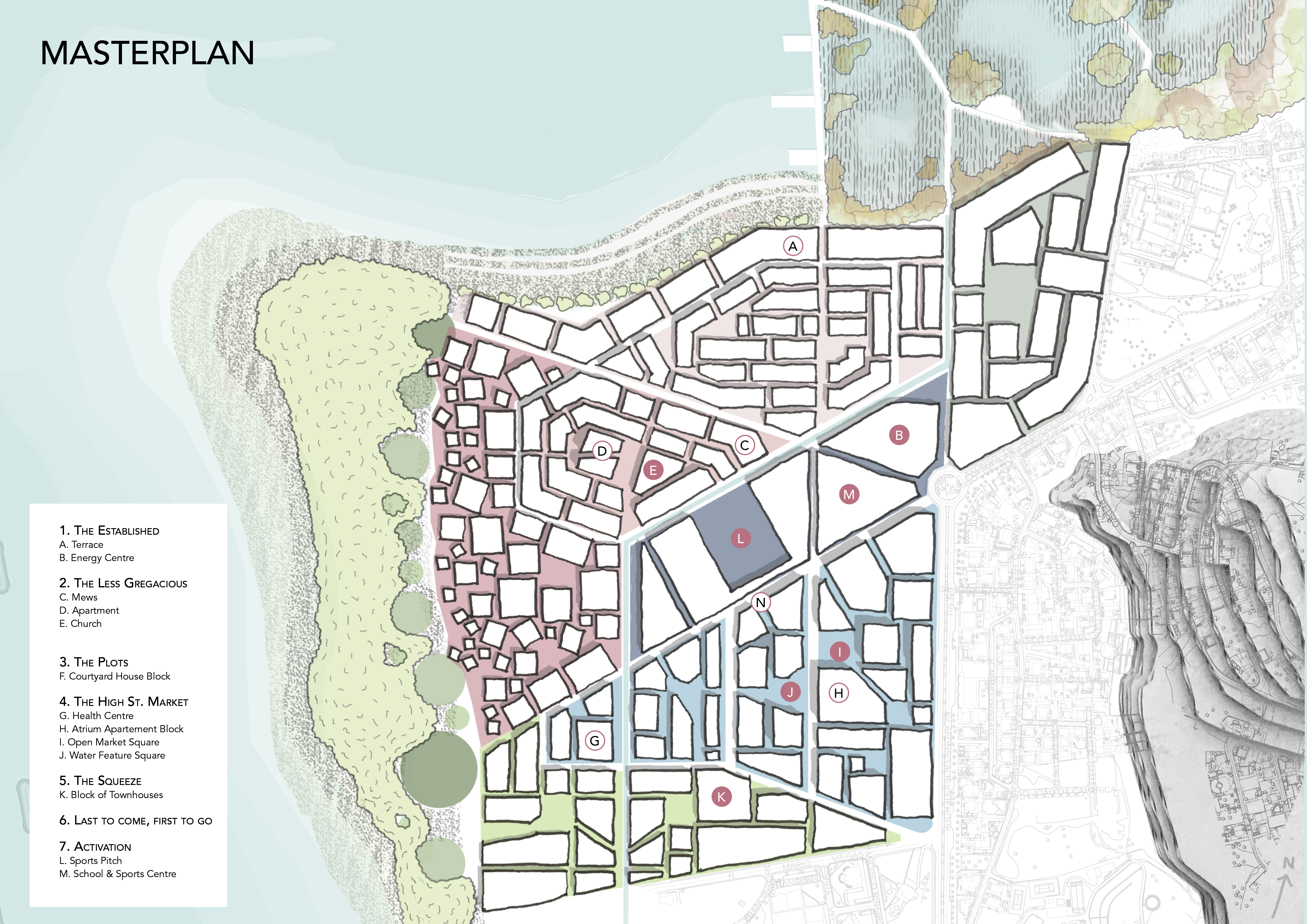 The masterplan takes precedent of the present context’s urban grain, namely Lisbon’s intimate cobbled pathways and Segundo Torrao’s informal neighbourhoods, to create climatically and culturally appropriate spaces. In the adoption of this strategy, principle housing typologies are employed to reflect the population and activities within. These distinctions are visible in the overall masterplan layout.