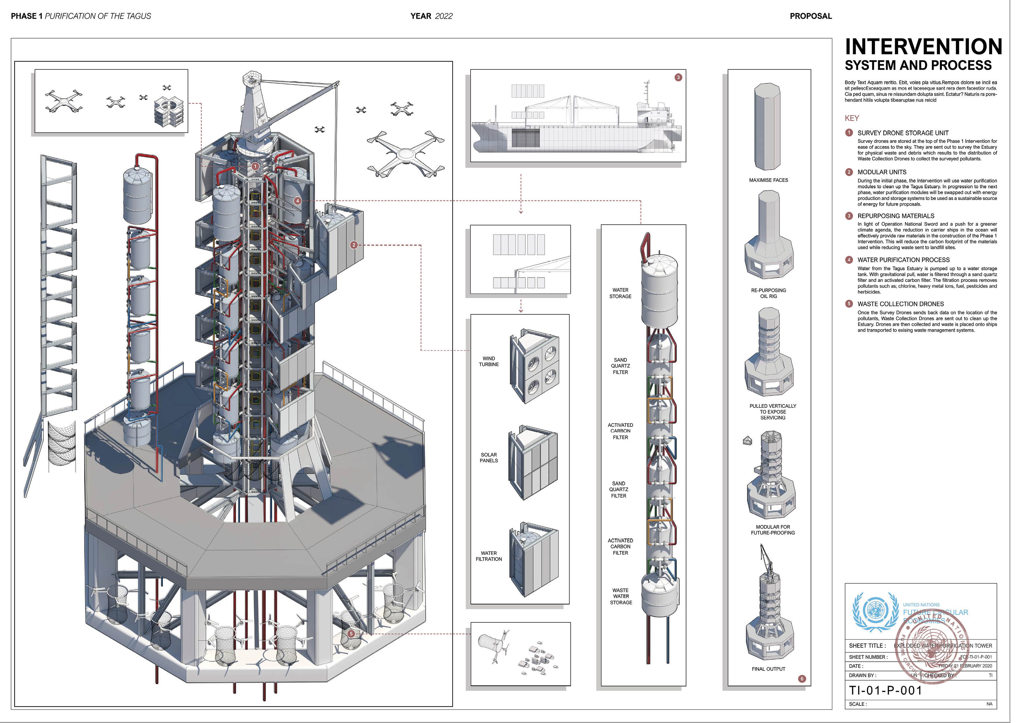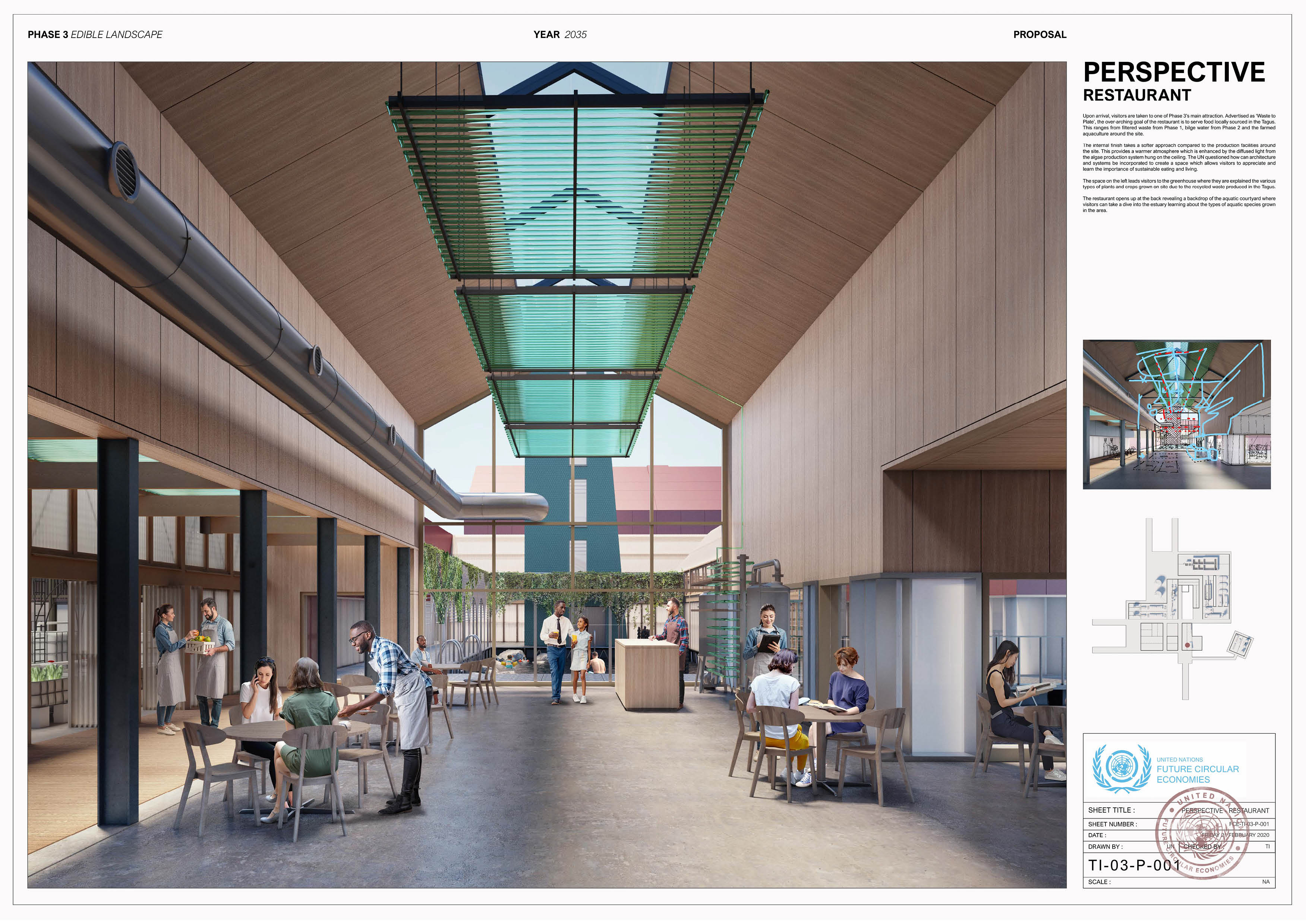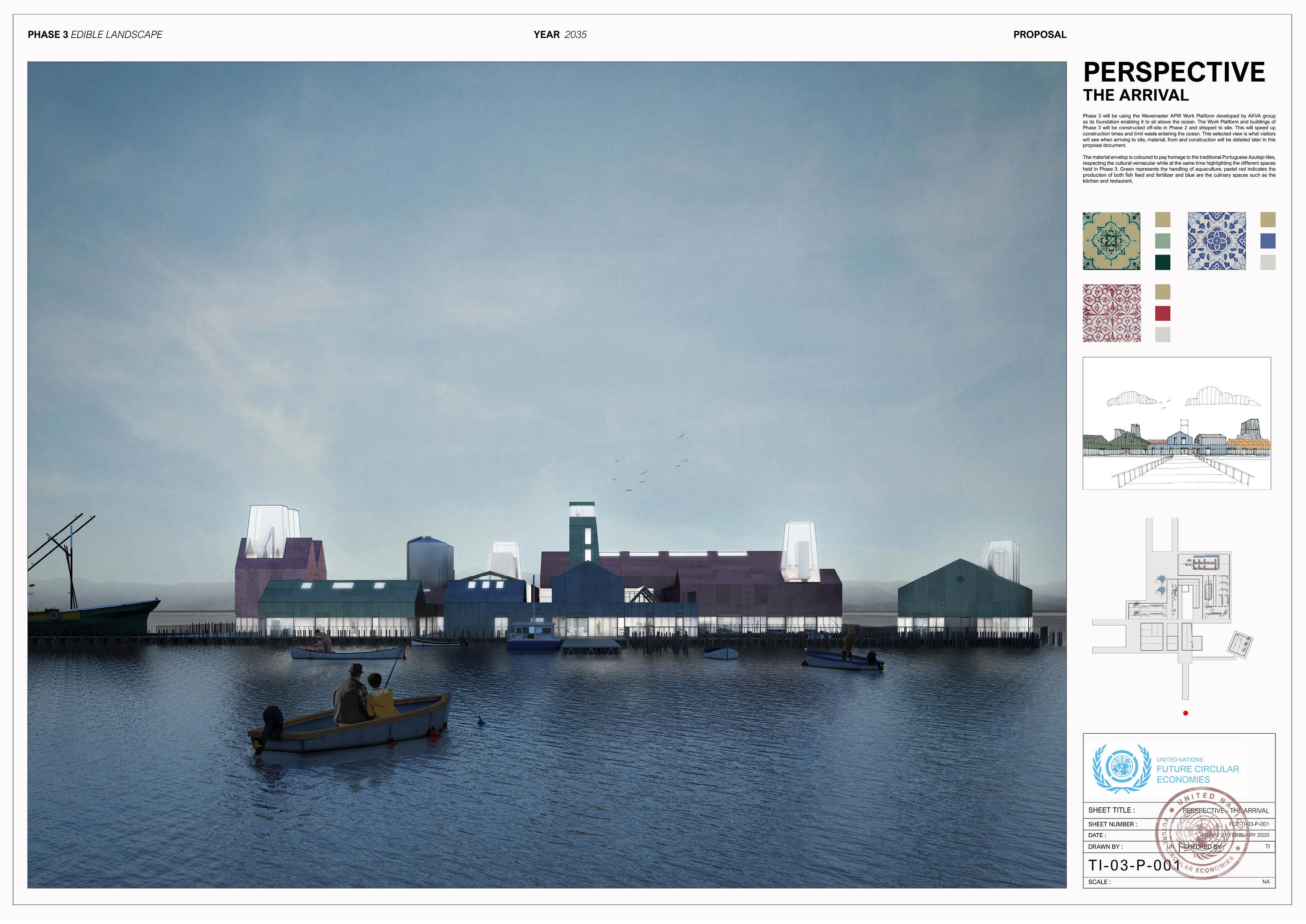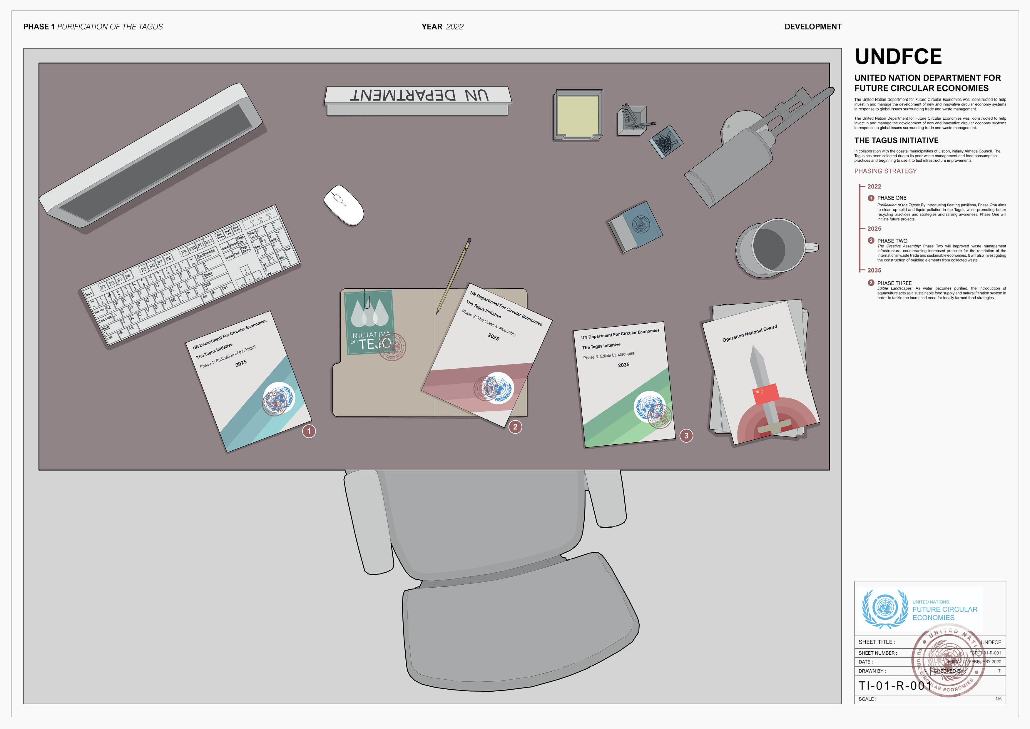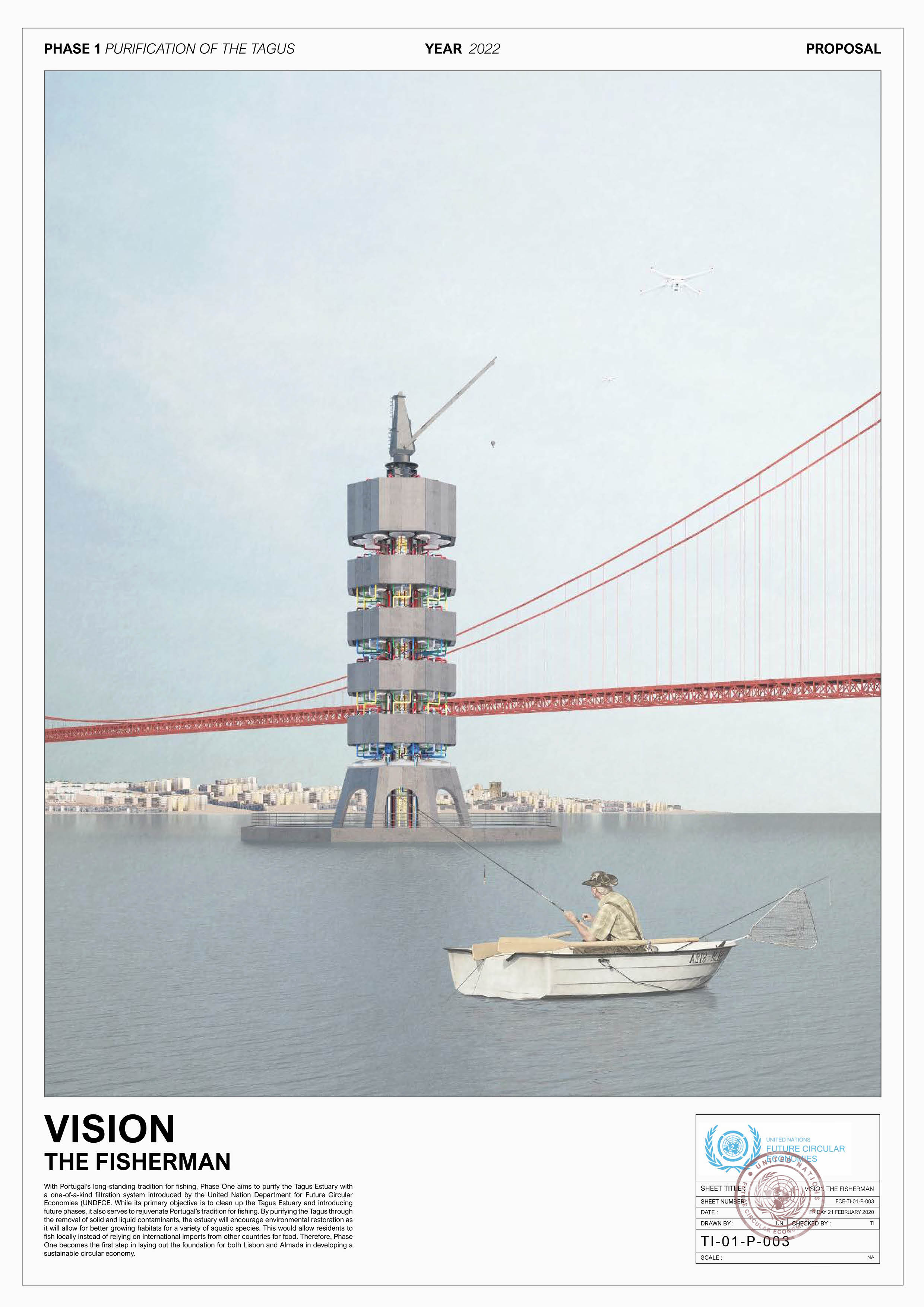 The United Nation Department for Future Circular Economies is constructed to help invest in and manage the development of new and innovative circular systems. This led to the creation of the Tagus Initiative and the introduction of Phase One. Phase One, Purification of the Tagus, sees the deployment of a number of floating pavilions in the Tagus. Their main aim is to filter water and remove both solid and liquid waste from the river. With the completion of Phase One, Phase Two, The Creative Reassembly, tackle underdeveloped waste management infrastructure in the area of Almada through a focus on reuse and reassembly. The centre focuses on reuse before the heavy processing of recycling. Phase Three will implement a sustainable circular economy through aquaculture, which will reduce Portugal’s dependency on imported seafood by locally cultivating native fish and shellfish.
