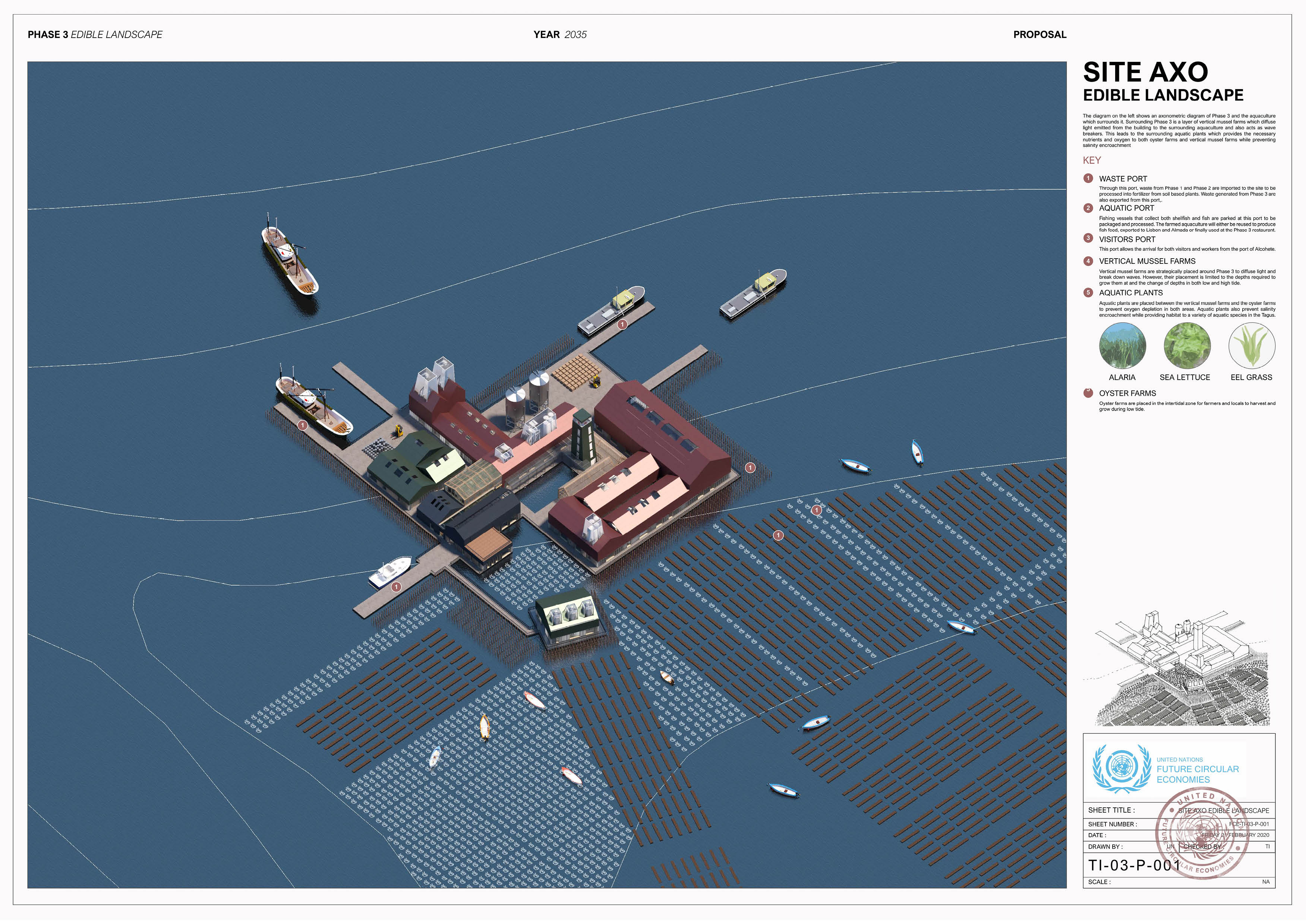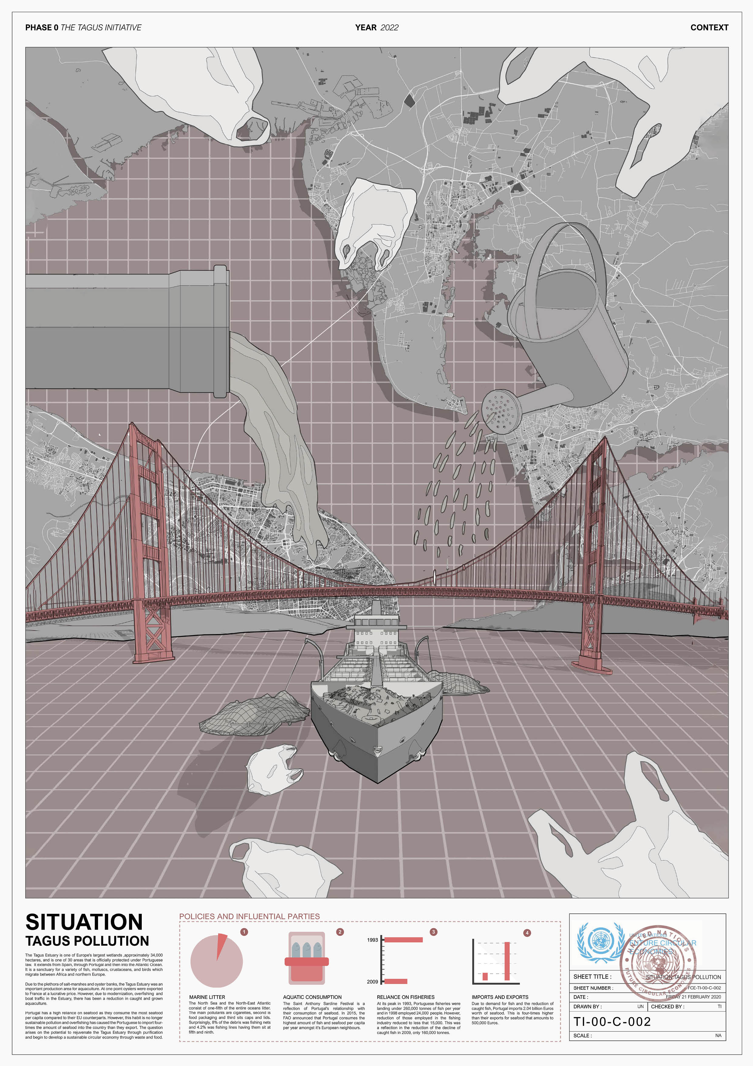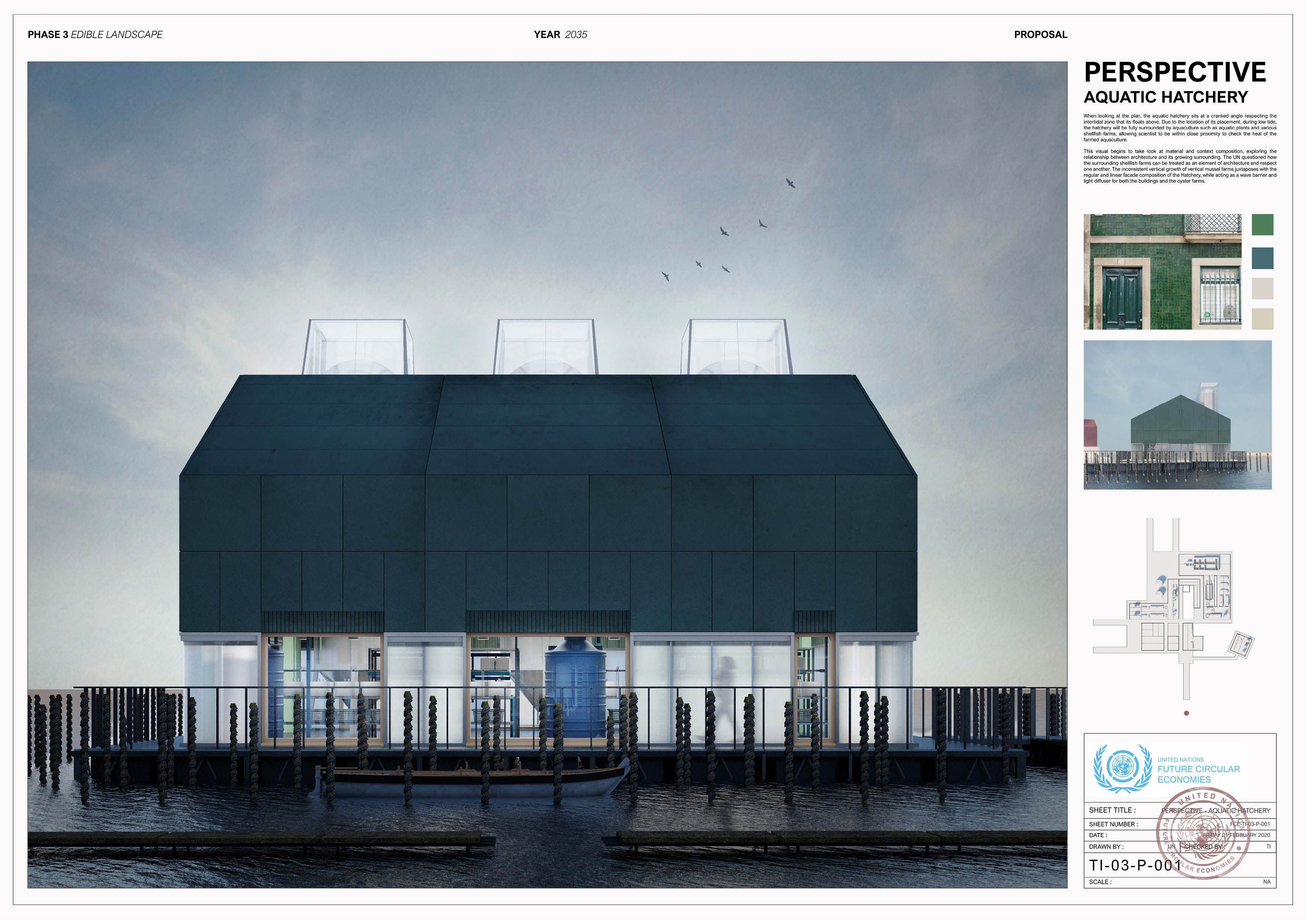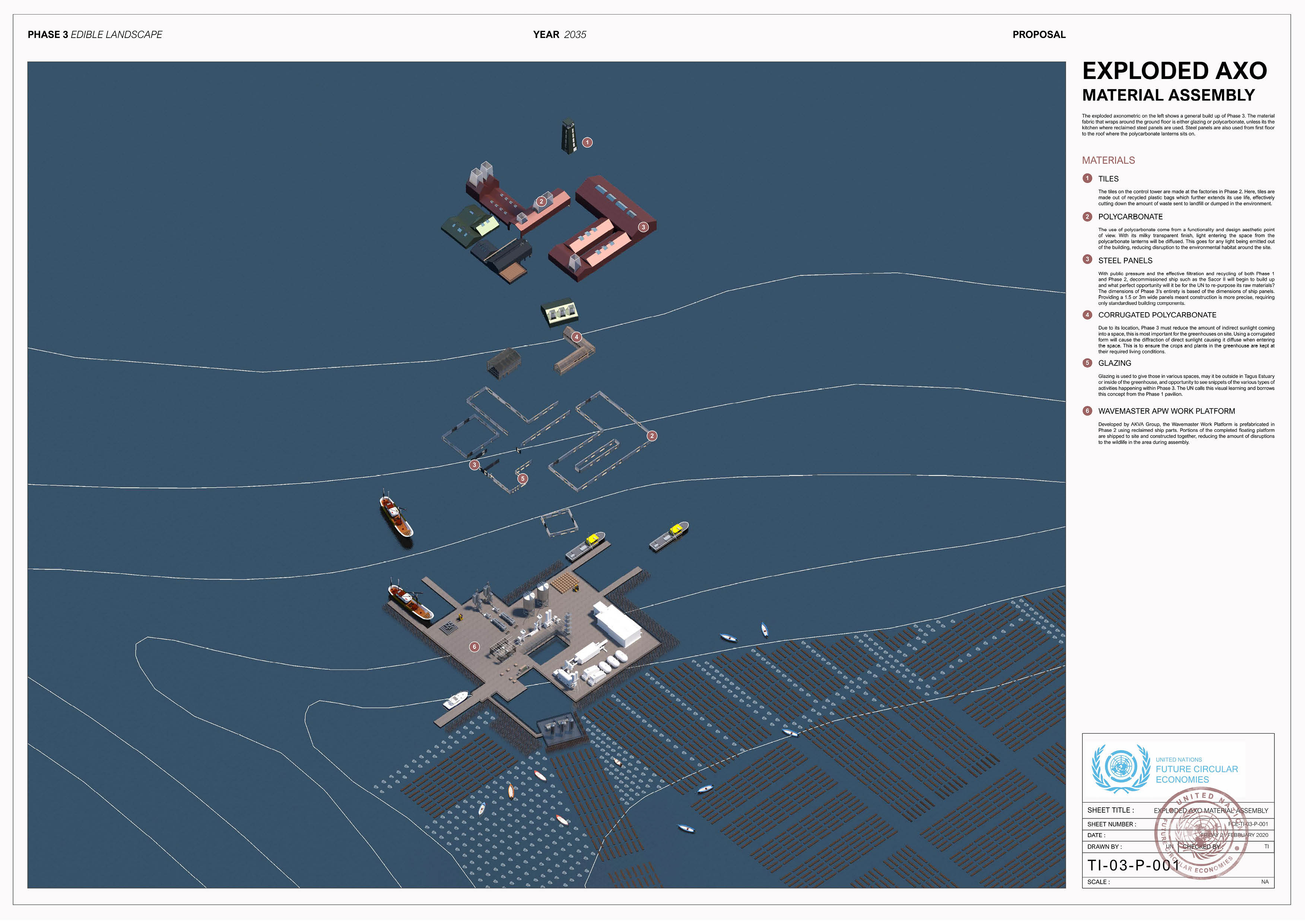 The United Nation Department for Future Circular Economies is constructed to help invest in and manage the development of new and innovative circular systems. This led to the creation of the Tagus Initiative and the introduction of Phase One. Phase One, Purification of the Tagus, sees the deployment of a number of floating pavilions in the Tagus. Their main aim is to filter water and remove both solid and liquid waste from the river. With the completion of Phase One, Phase Two, The Creative Reassembly, tackle underdeveloped waste management infrastructure in the area of Almada through a focus on reuse and reassembly. The centre focuses on reuse before the heavy processing of recycling. Phase Three will implement a sustainable circular economy through aquaculture, which will reduce Portugal’s dependency on imported seafood by locally cultivating native fish and shellfish.