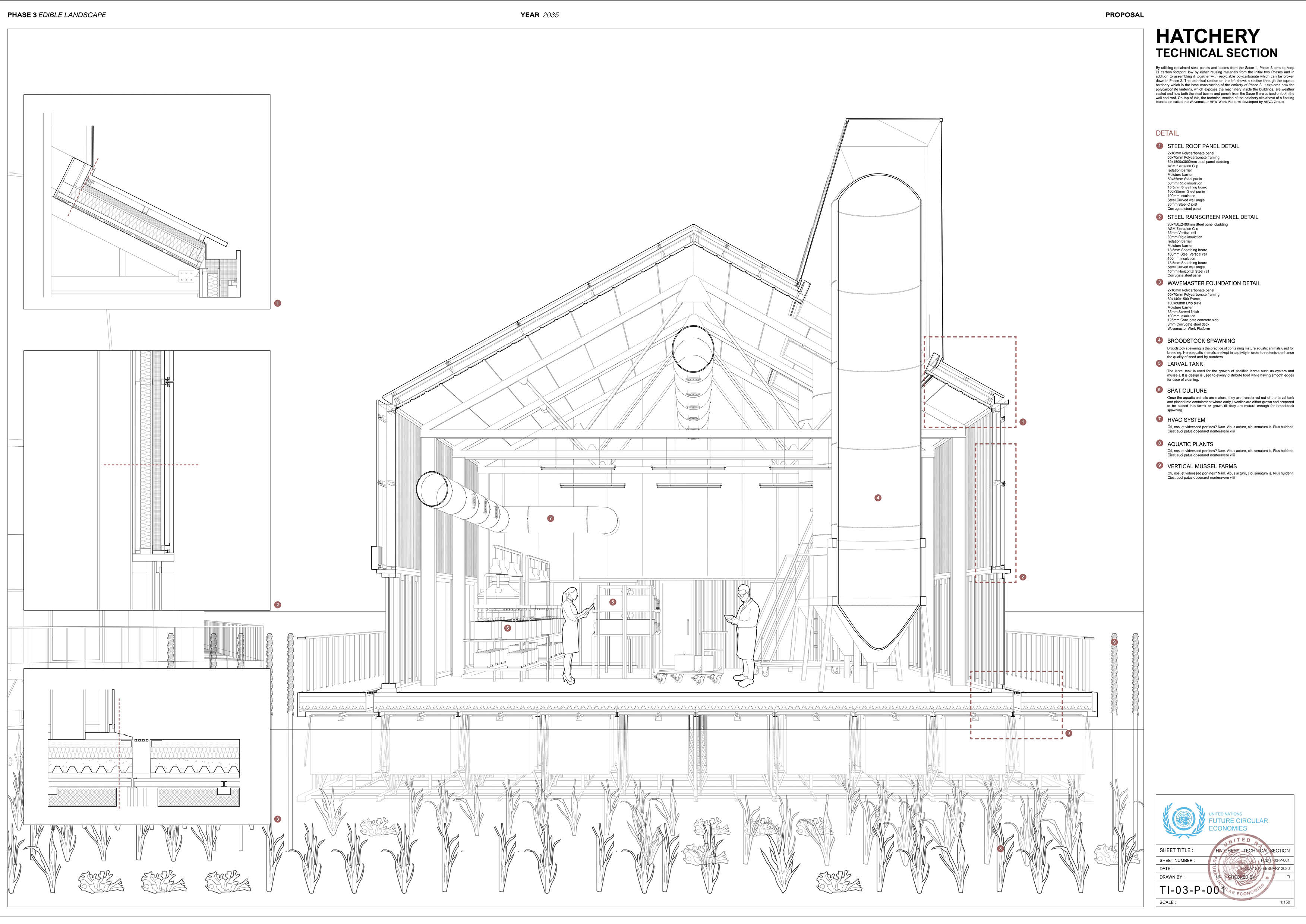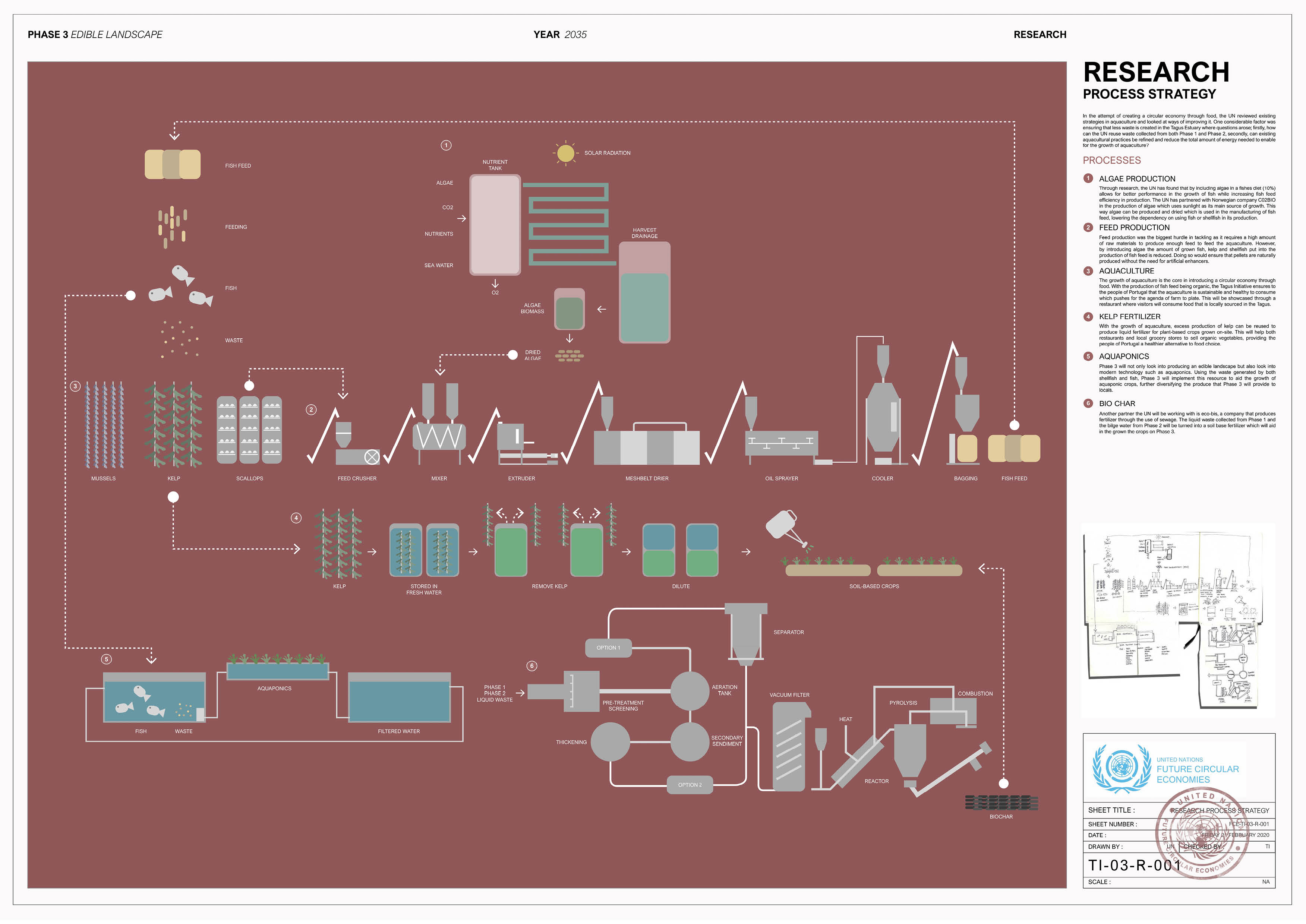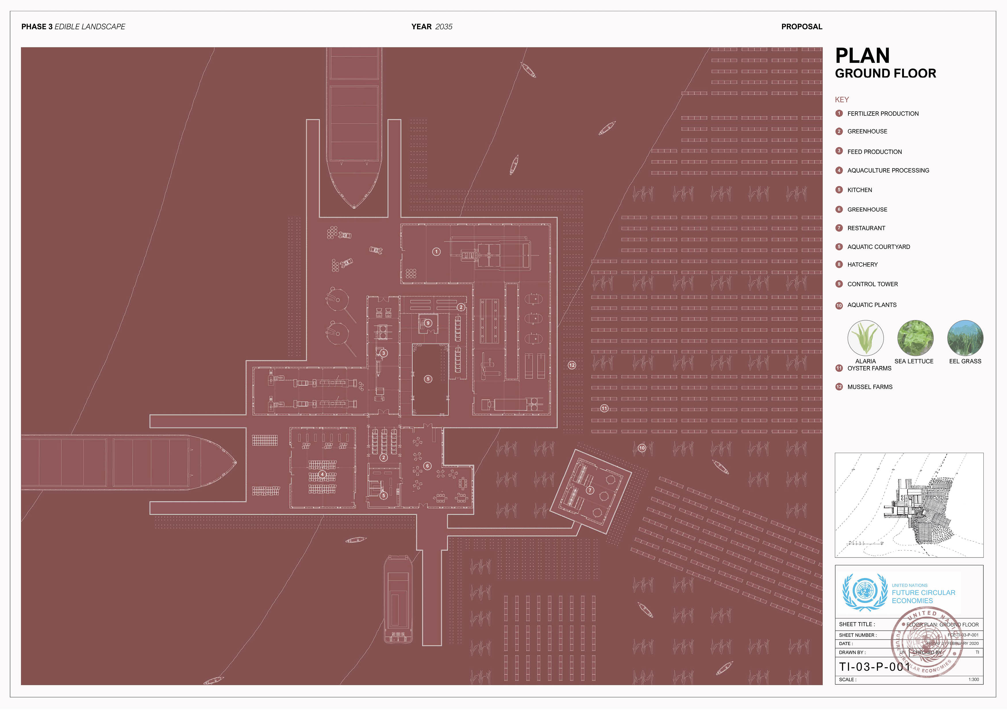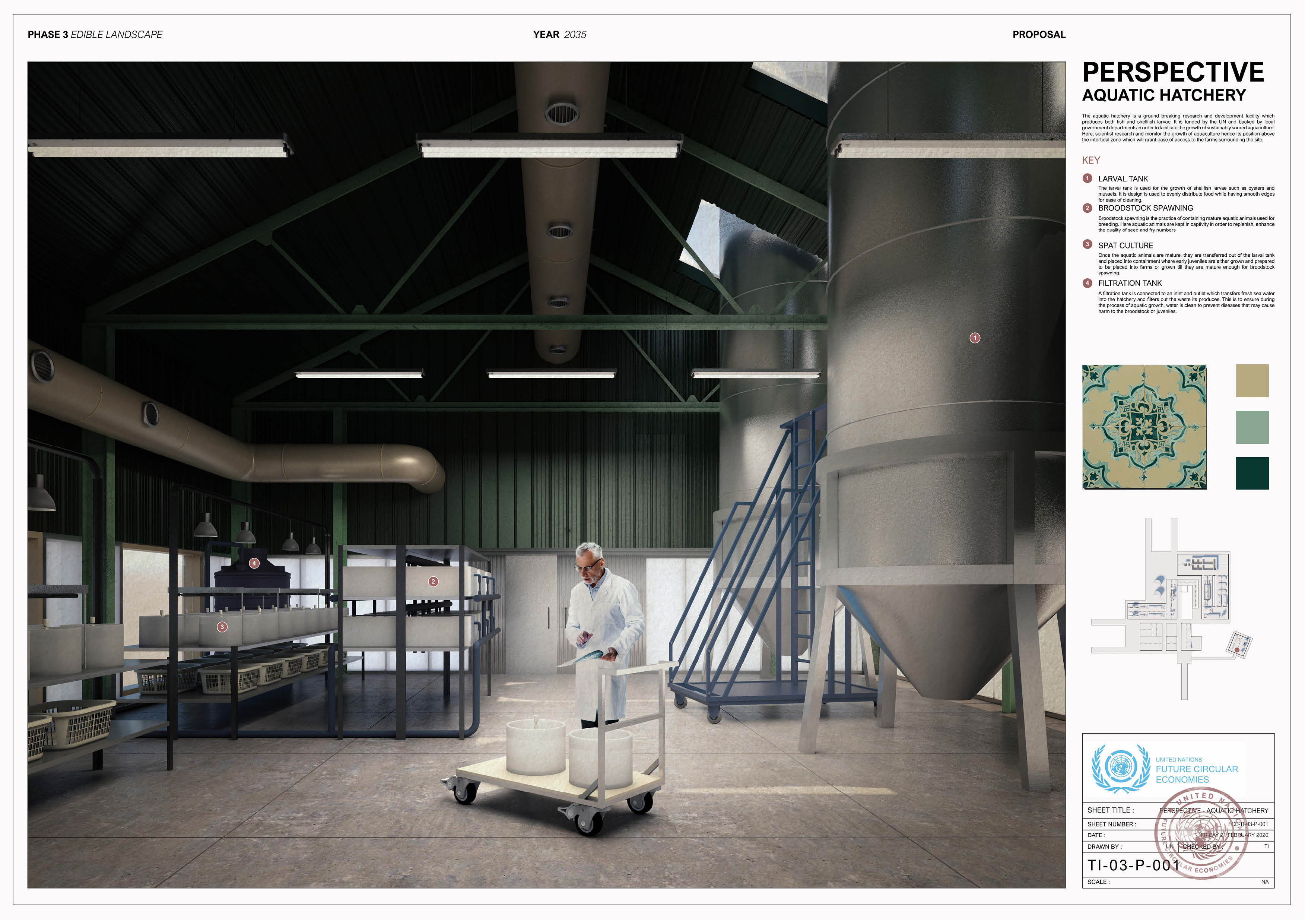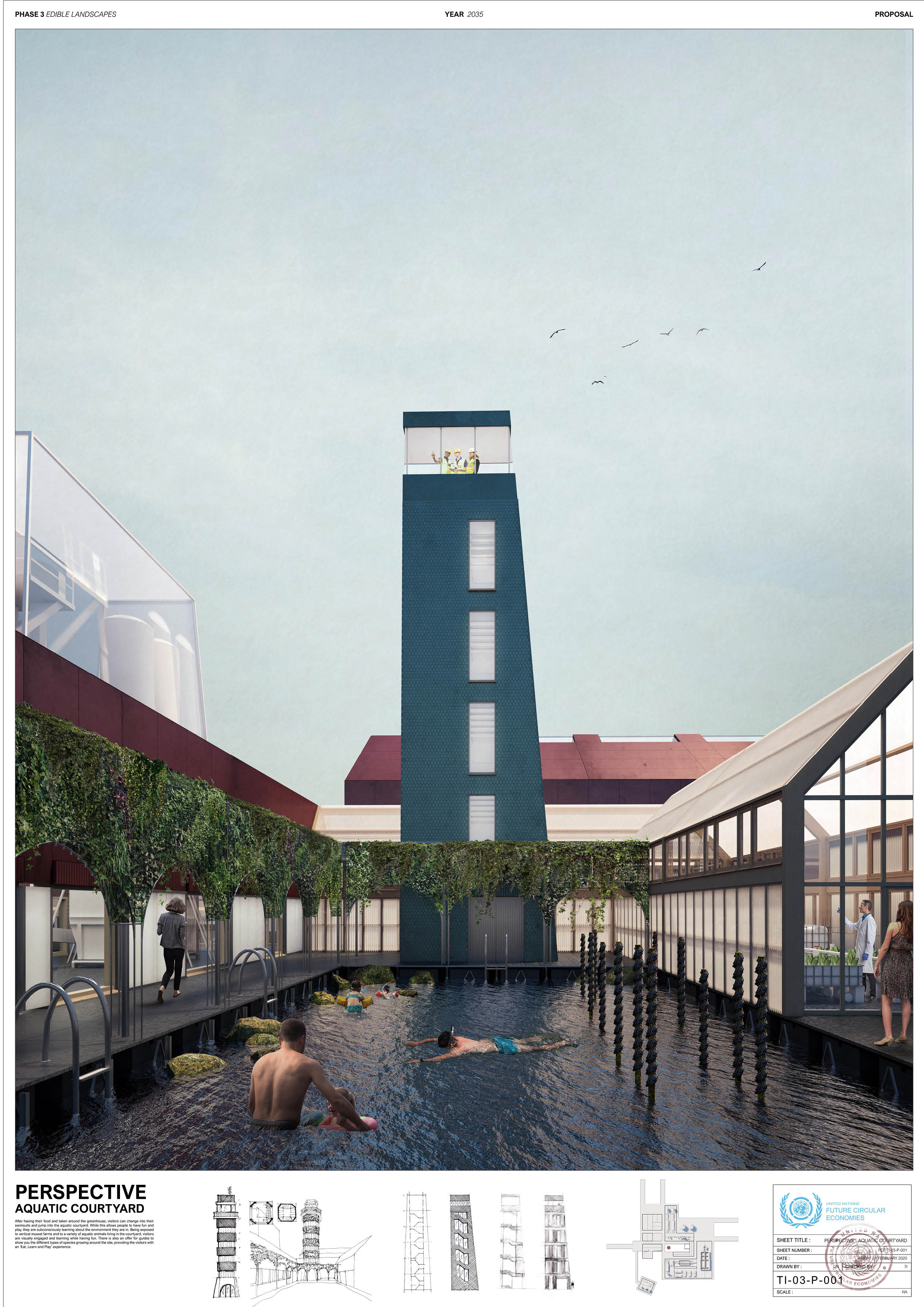 The United Nation Department for Future Circular Economies is constructed to help invest in and manage the development of new and innovative circular systems. This led to the creation of the Tagus Initiative and the introduction of Phase One. Phase One, Purification of the Tagus, sees the deployment of a number of floating pavilions in the Tagus. Their main aim is to filter water and remove both solid and liquid waste from the river. With the completion of Phase One, Phase Two, The Creative Reassembly, tackle underdeveloped waste management infrastructure in the area of Almada through a focus on reuse and reassembly. The centre focuses on reuse before the heavy processing of recycling. Phase Three will implement a sustainable circular economy through aquaculture, which will reduce Portugal’s dependency on imported seafood by locally cultivating native fish and shellfish.