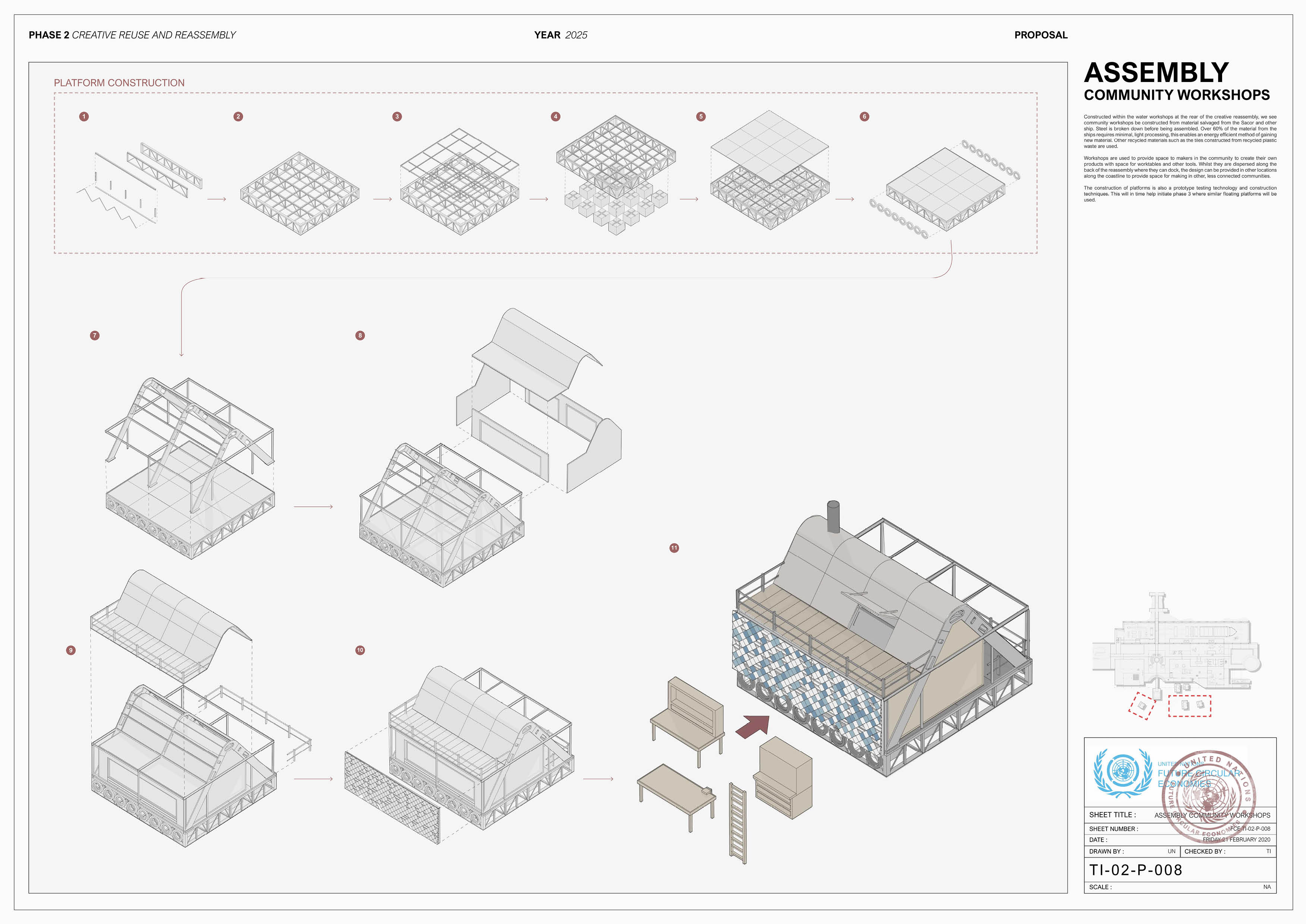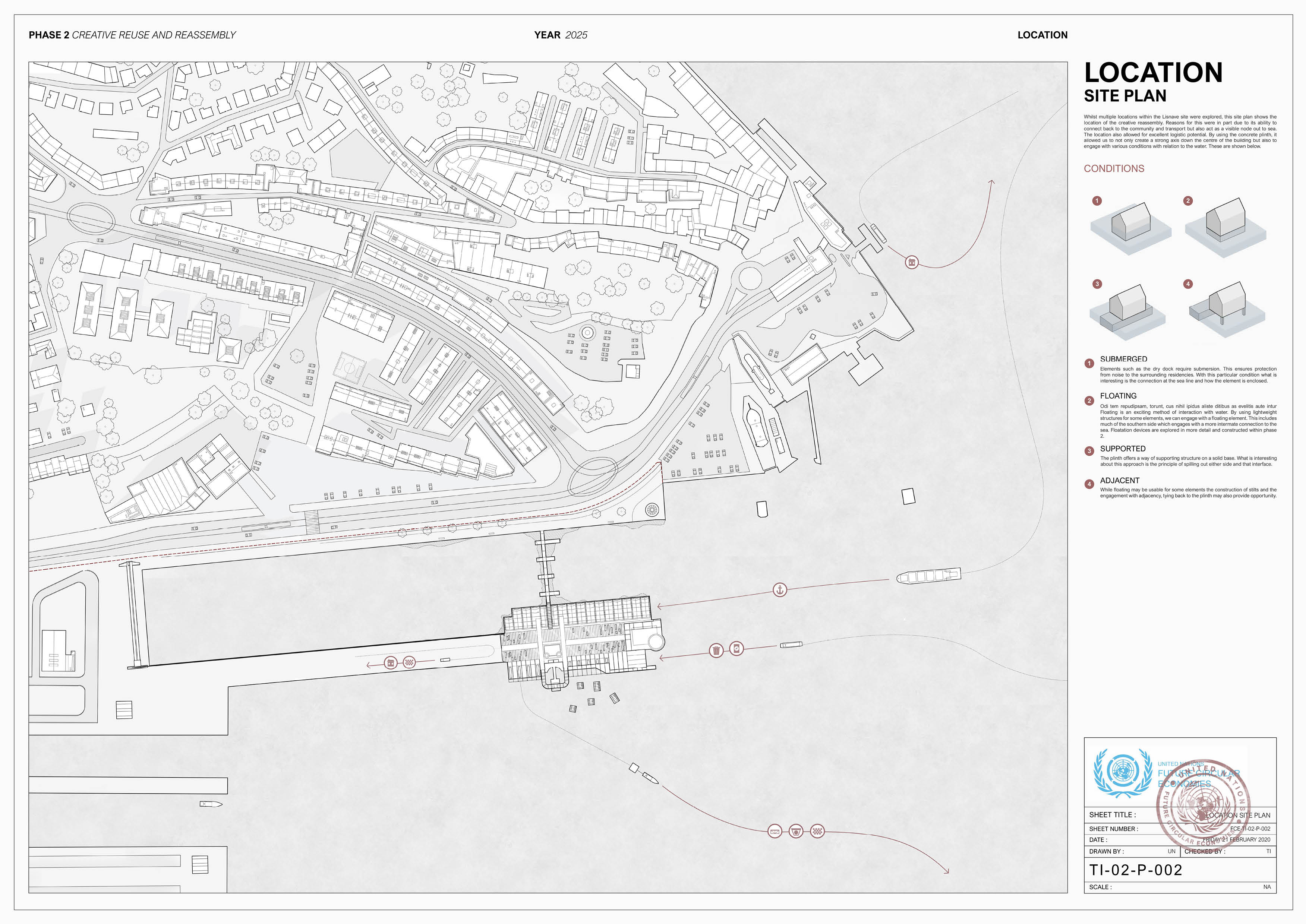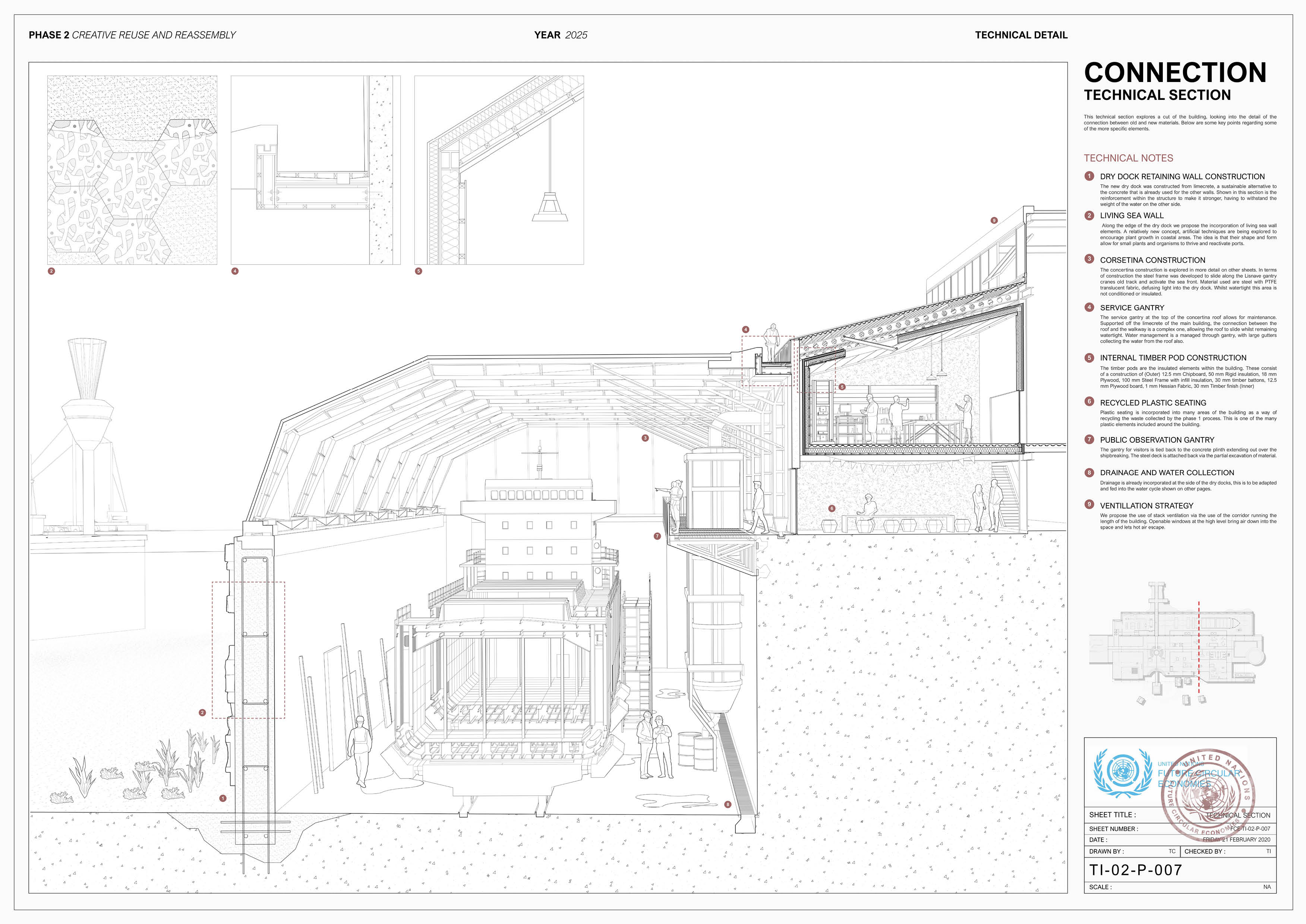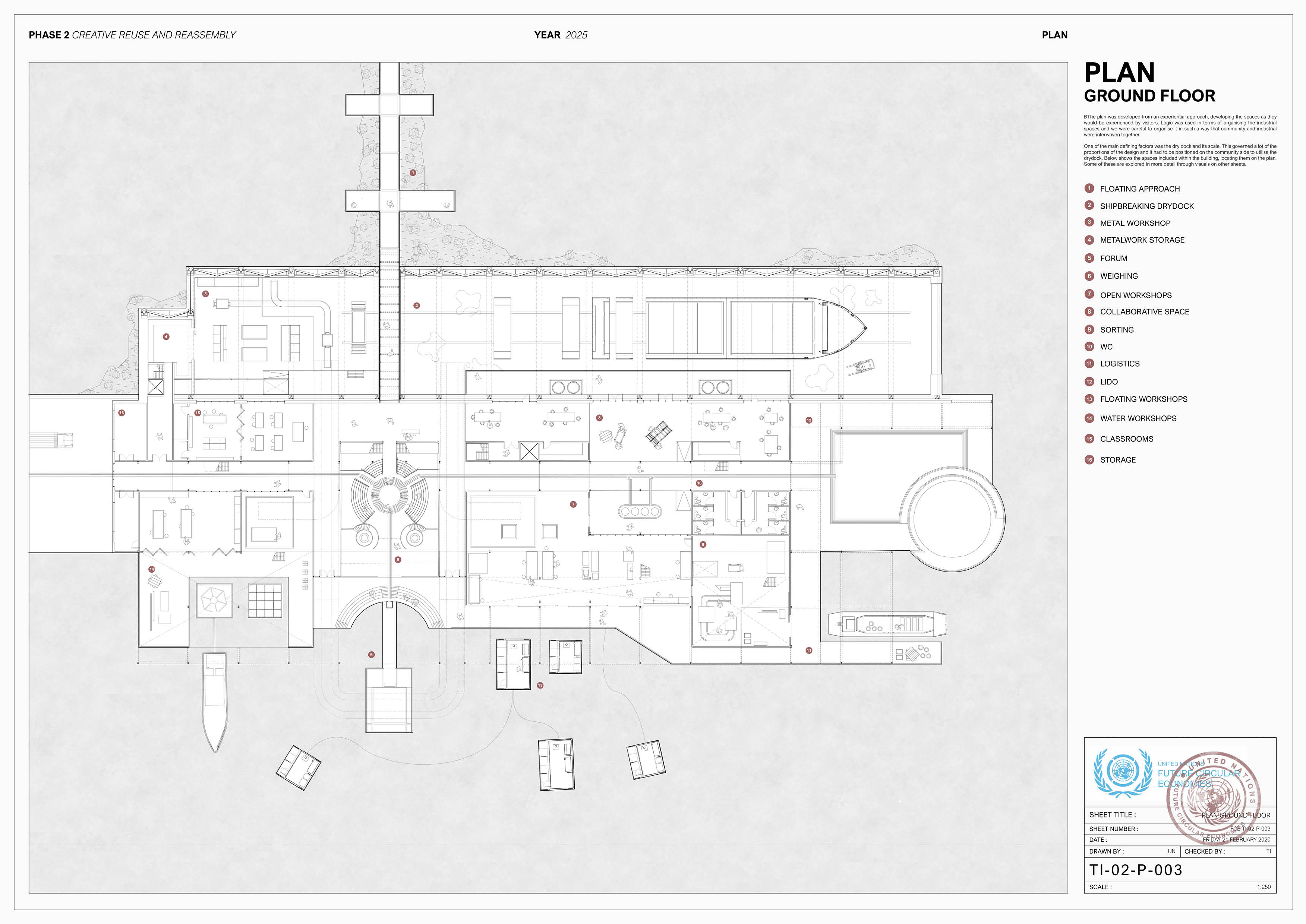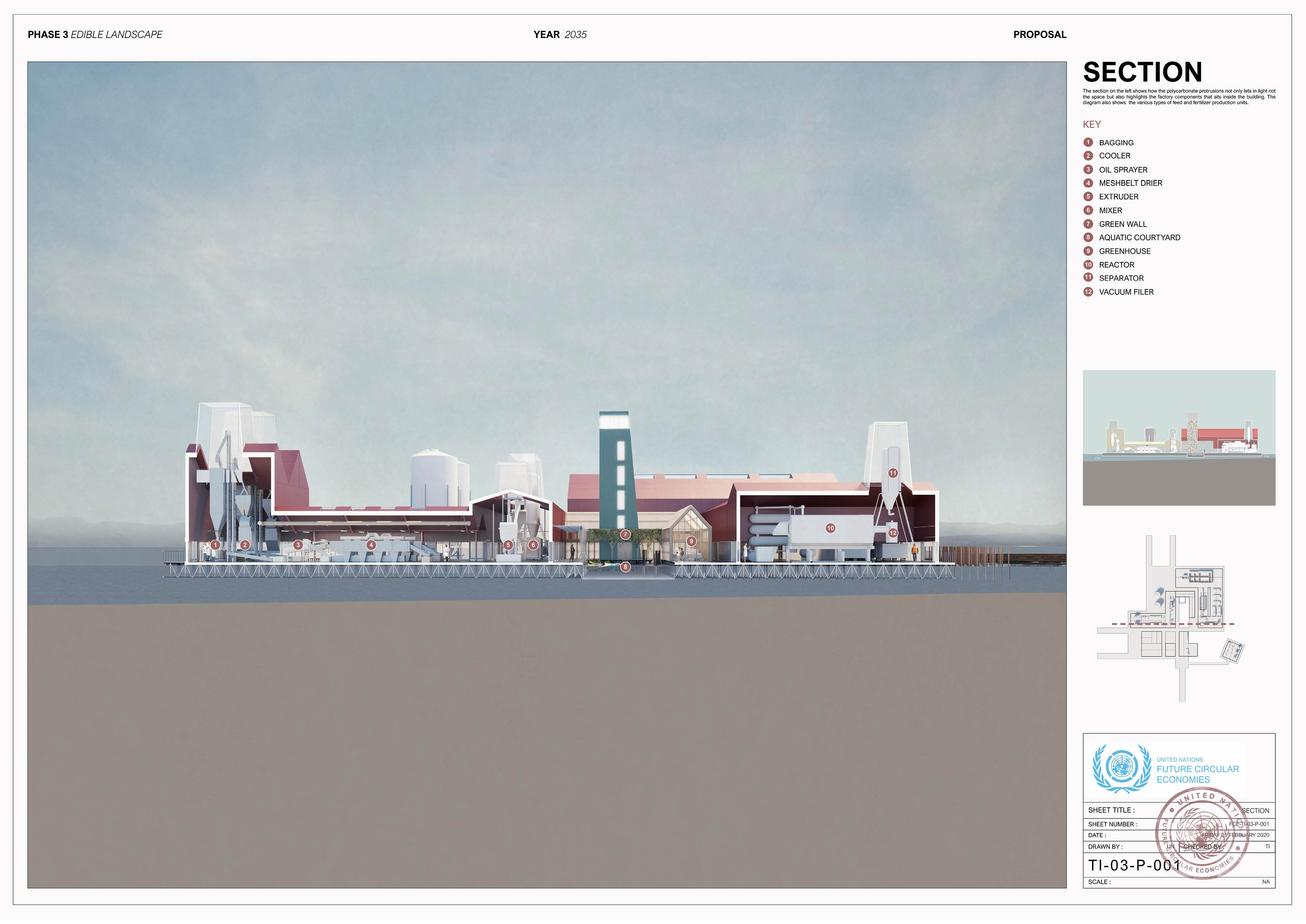 The United Nation Department for Future Circular Economies is constructed to help invest in and manage the development of new and innovative circular systems. This led to the creation of the Tagus Initiative and the introduction of Phase One. Phase One, Purification of the Tagus, sees the deployment of a number of floating pavilions in the Tagus. Their main aim is to filter water and remove both solid and liquid waste from the river. With the completion of Phase One, Phase Two, The Creative Reassembly, tackle underdeveloped waste management infrastructure in the area of Almada through a focus on reuse and reassembly. The centre focuses on reuse before the heavy processing of recycling. Phase Three will implement a sustainable circular economy through aquaculture, which will reduce Portugal’s dependency on imported seafood by locally cultivating native fish and shellfish.